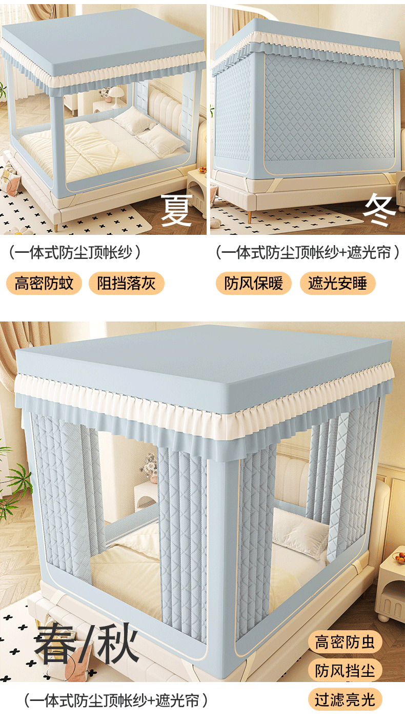 2025新款2604冬季保暖夹棉纯色遮光帘蚊帐全底回底双排储物袋