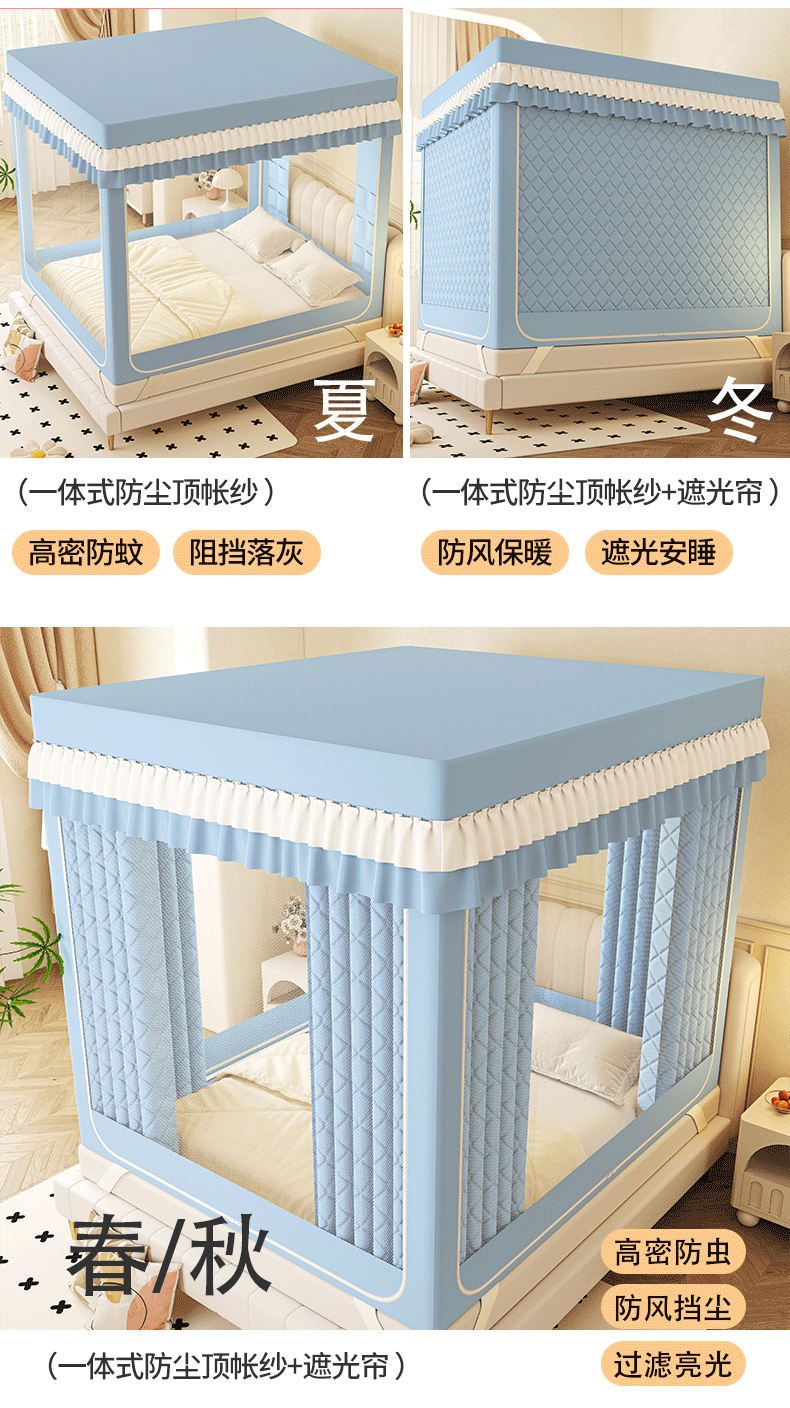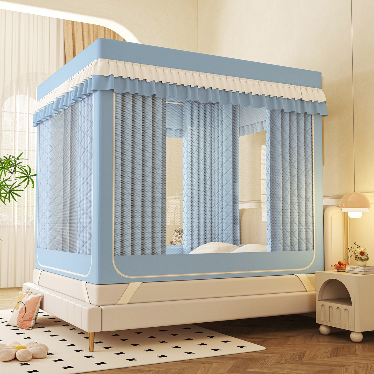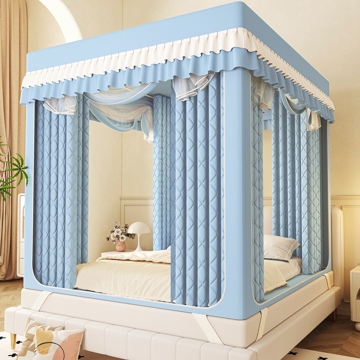 迪凡保罗蚊帐 2025新款2604冬季保暖夹棉纯色遮光帘蚊帐全底回底双排储物袋 天蓝色