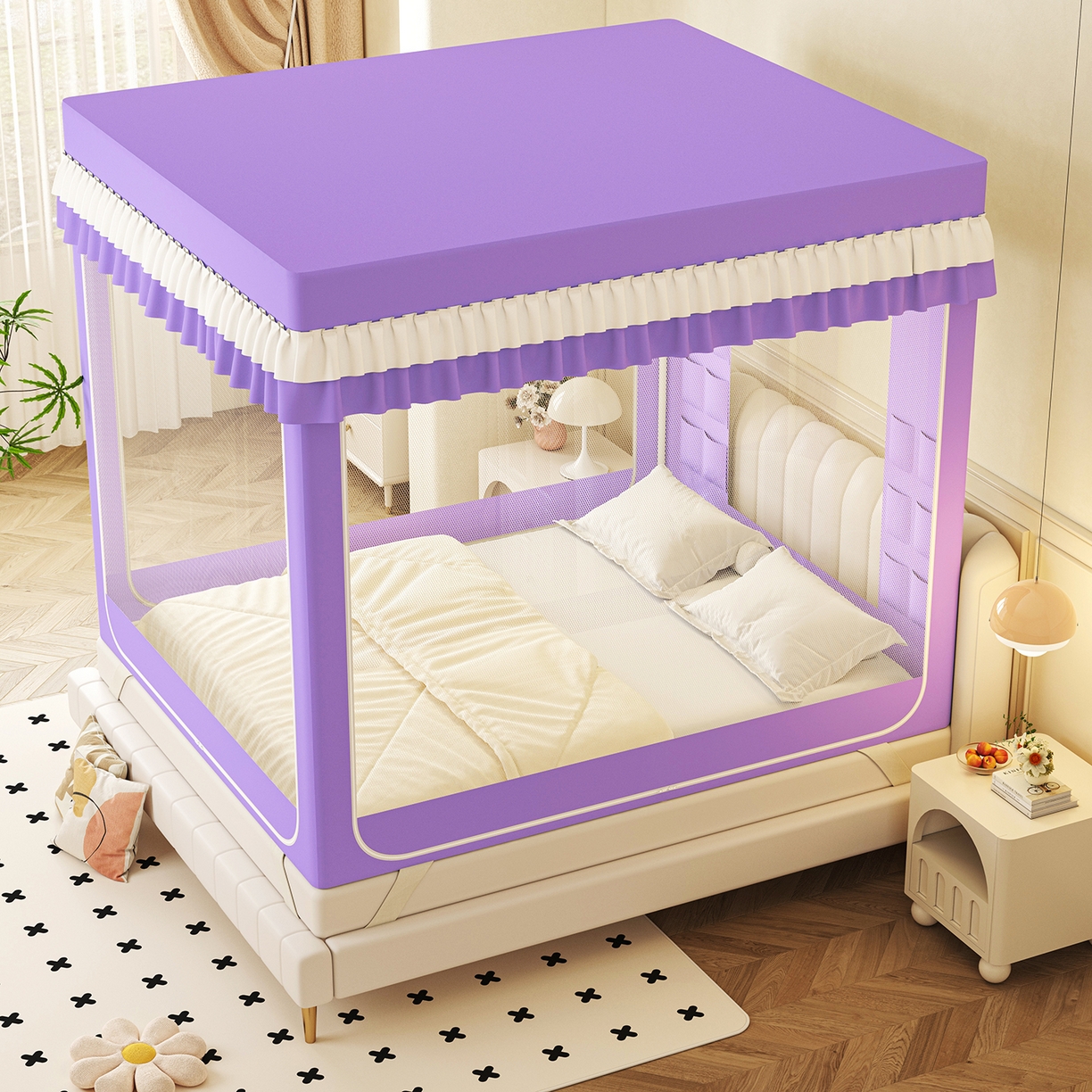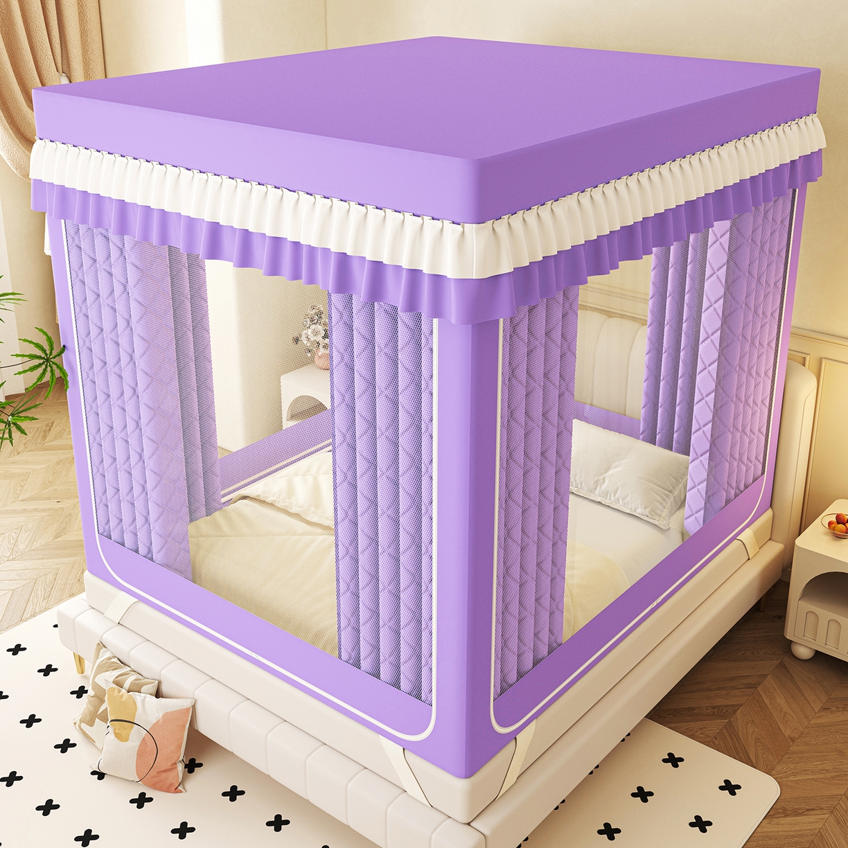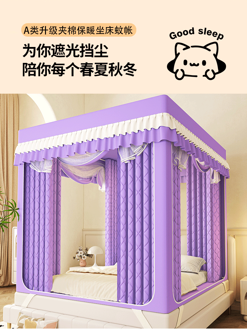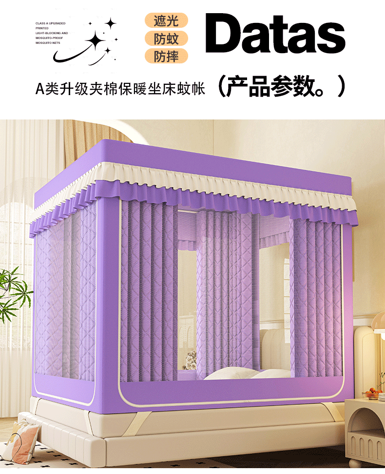 迪凡保罗蚊帐 2025新款2604冬季保暖夹棉纯色遮光帘蚊帐全底回底双排储物袋 紫色
