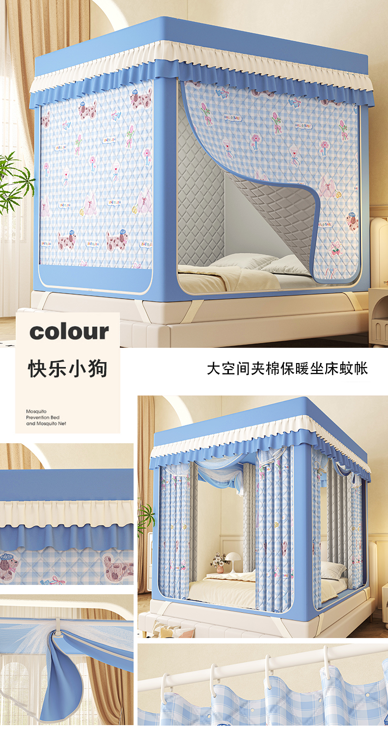 > 迪凡保罗蚊帐 2025新款2603冬季保暖夹棉印花遮光帘蚊帐全底回底双排储物袋 小狗乐园