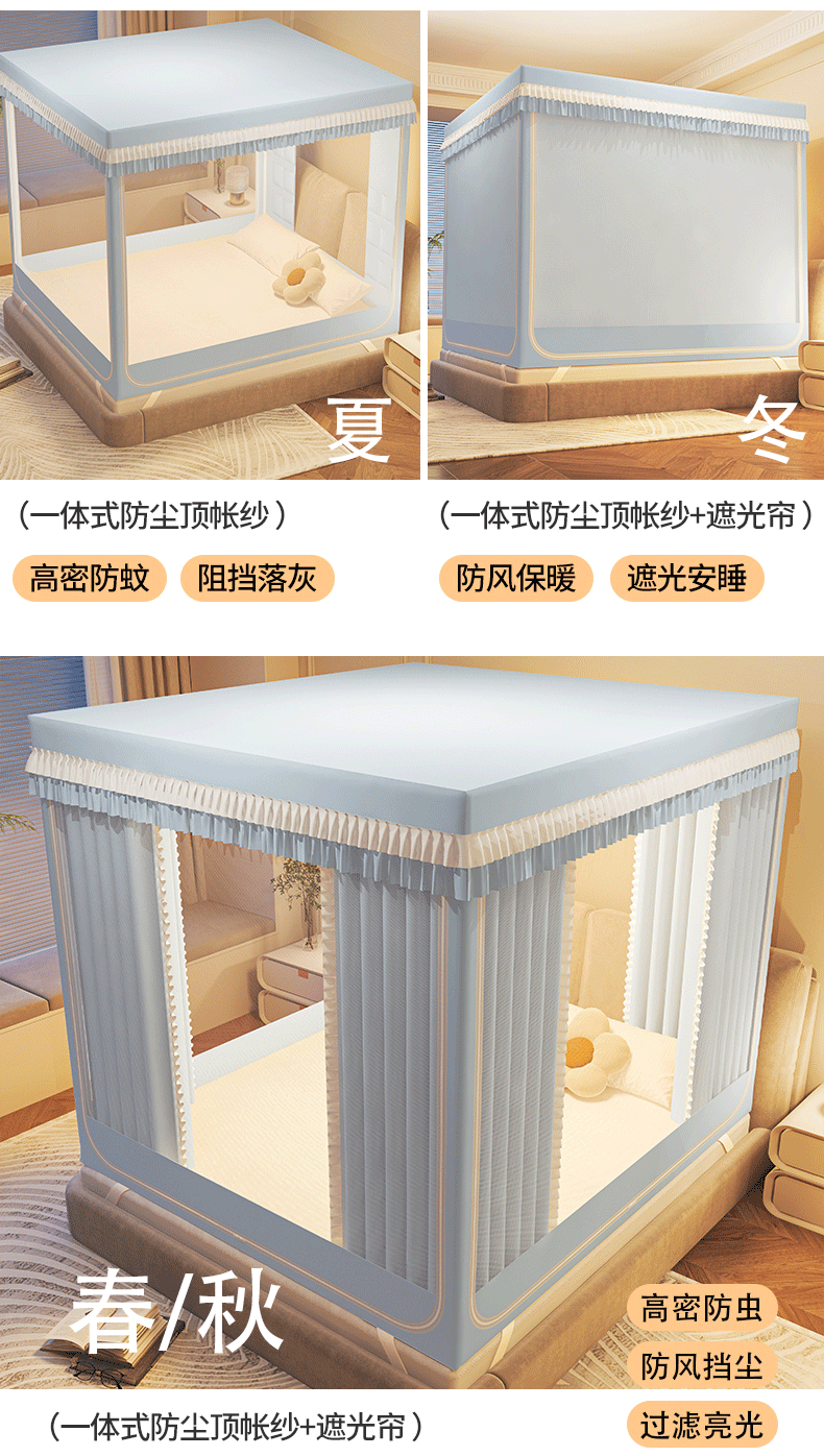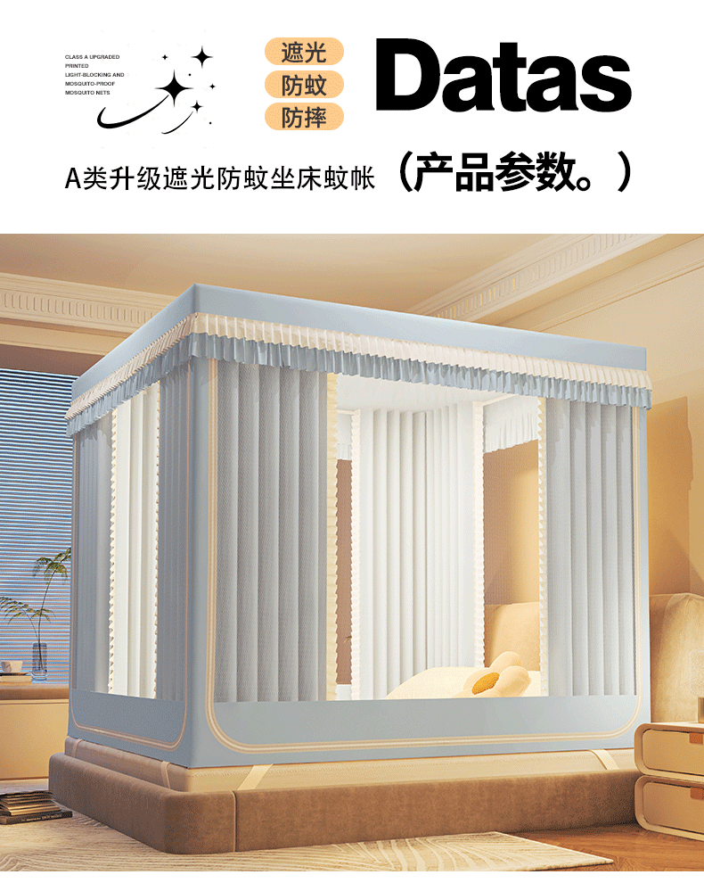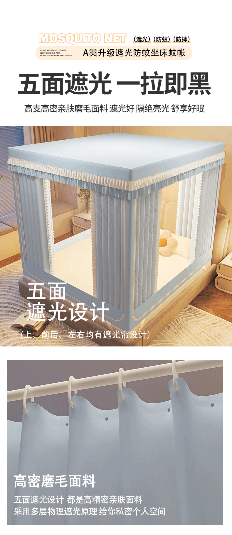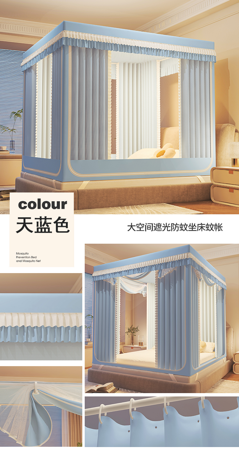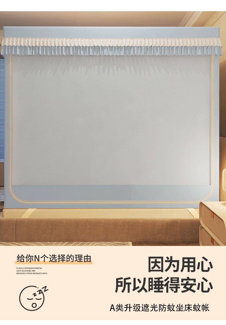 2025新款2602四季款纯色遮光帘坐床蚊帐全底回底双排储物袋