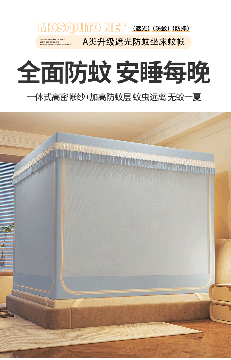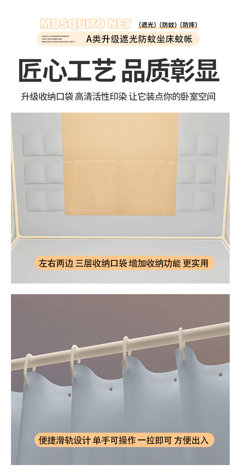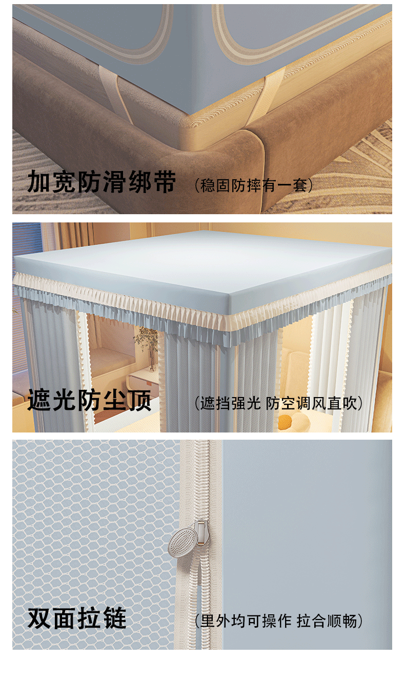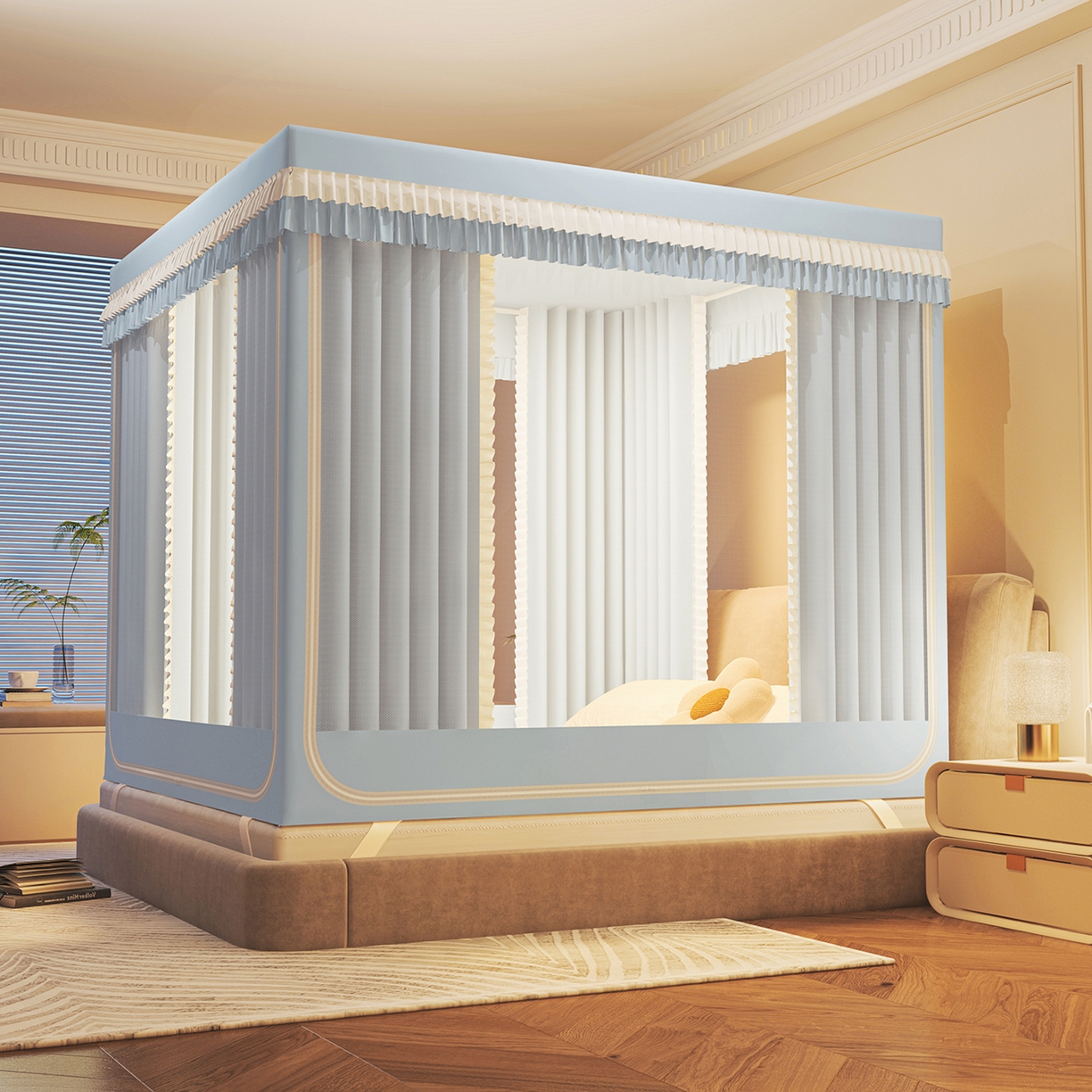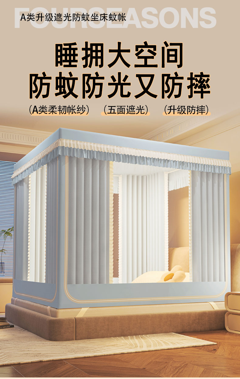 2025新款2602四季款纯色遮光帘坐床蚊帐全底回底双排储物袋