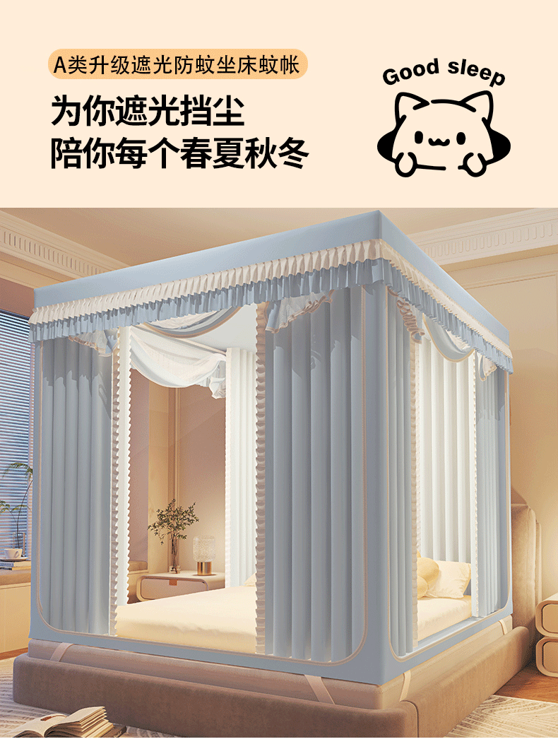 迪凡保罗蚊帐 2025新款2602四季款纯色遮光帘坐床蚊帐全底回底双排储物袋 蓝灰色-带床帘