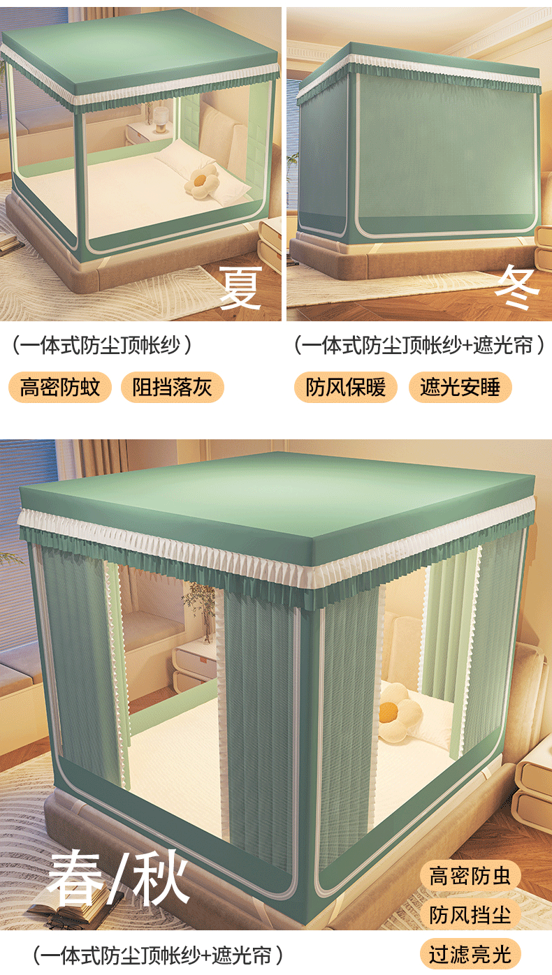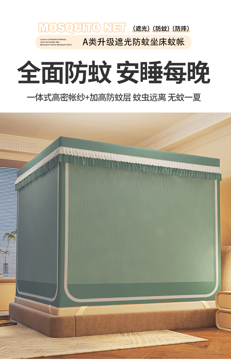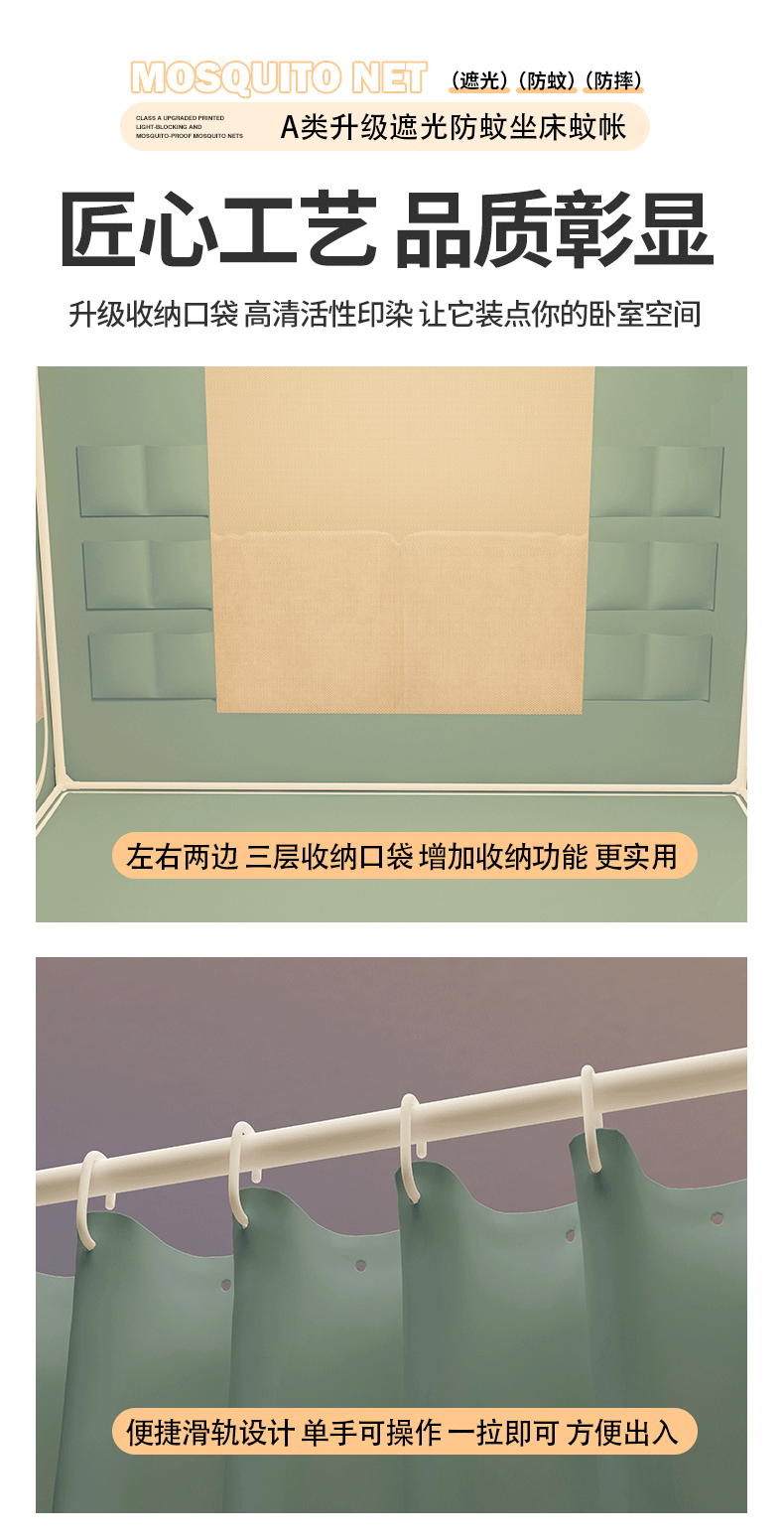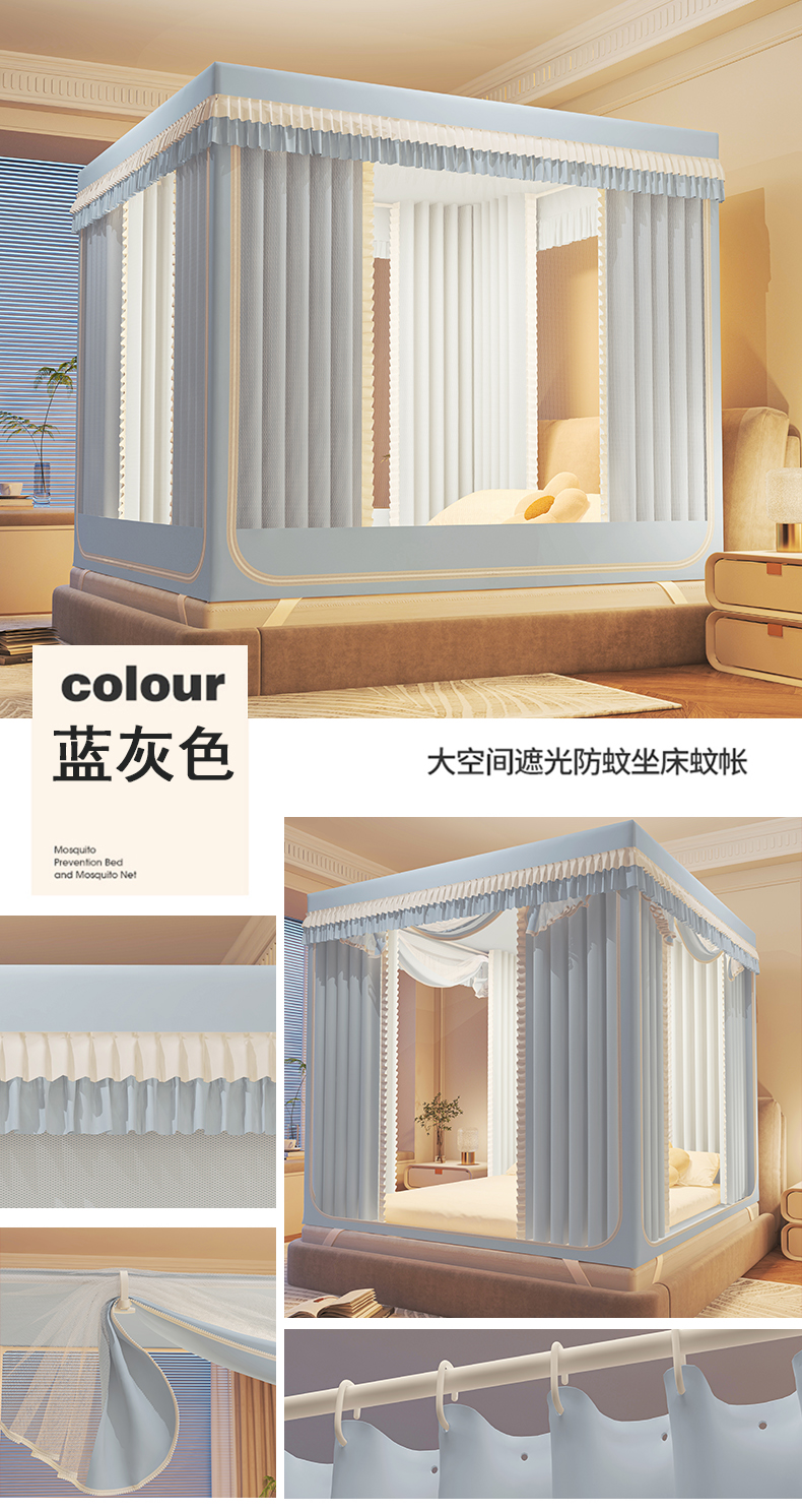 2025新款2602四季款纯色遮光帘坐床蚊帐全底回底双排储物袋