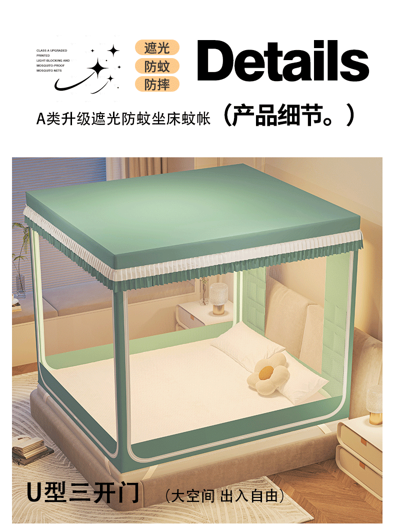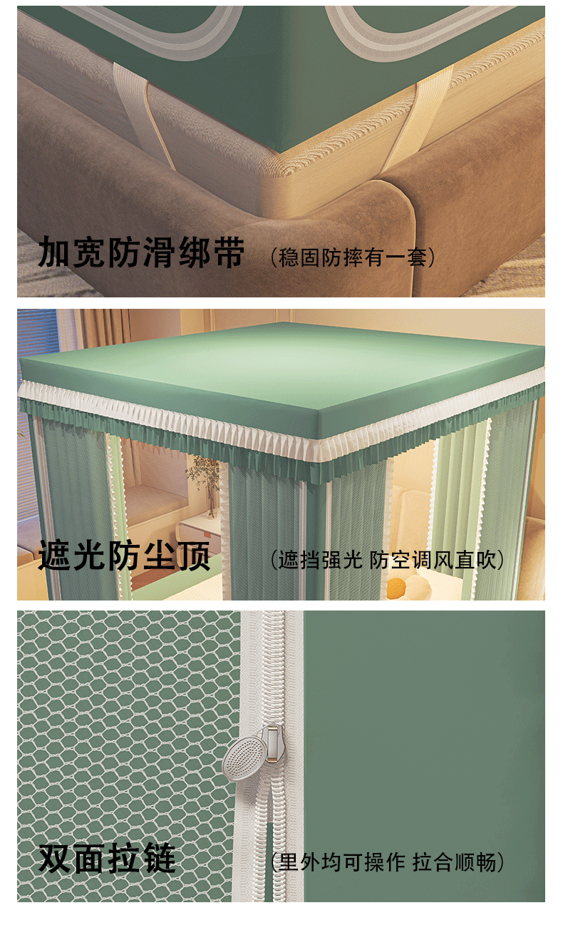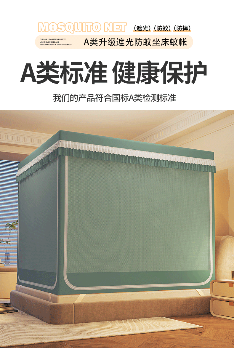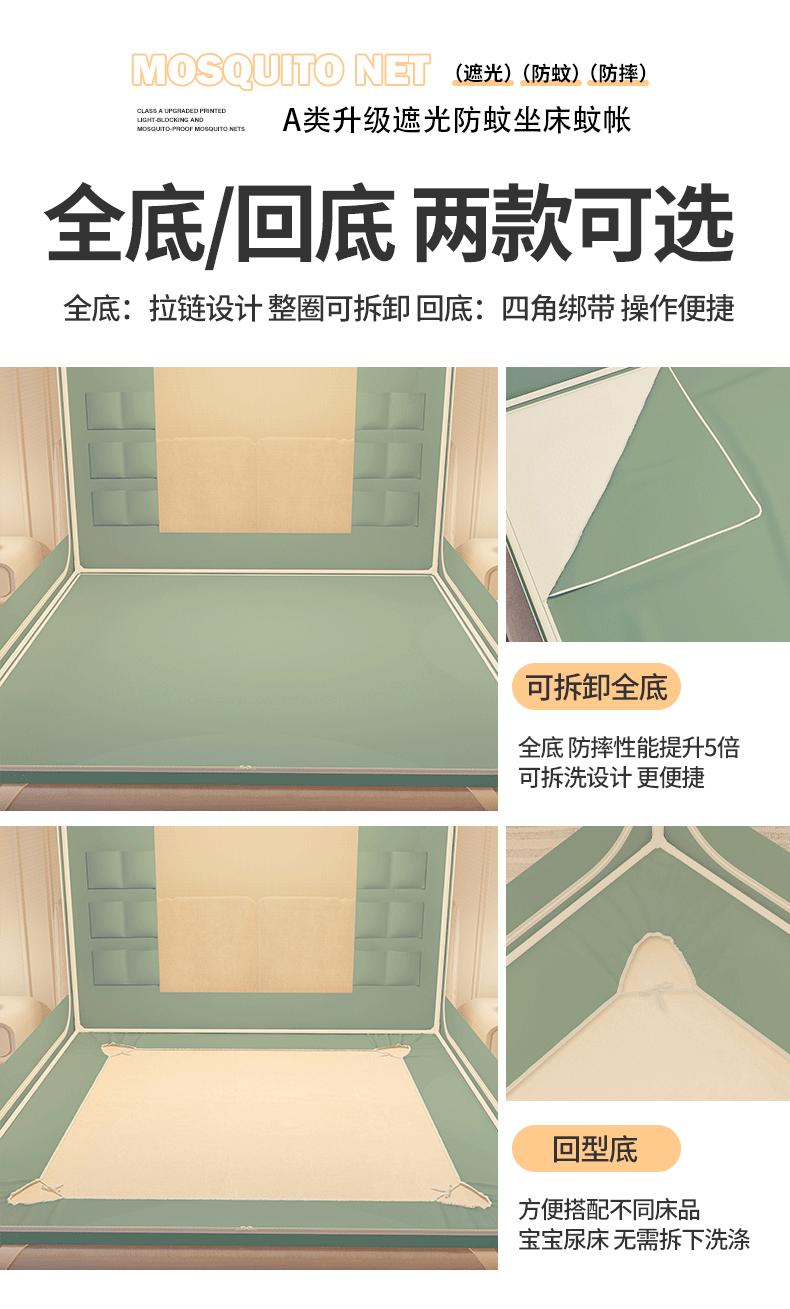 2025新款2602四季款纯色遮光帘坐床蚊帐全底回底双排储物袋