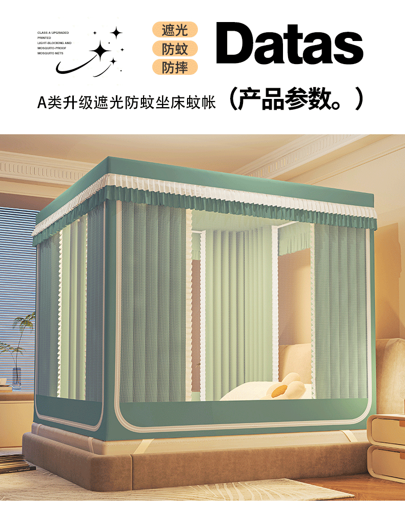 迪凡保罗蚊帐 2025新款2602四季款纯色遮光帘坐床蚊帐全底回底双排储物袋 太湖绿-带床帘