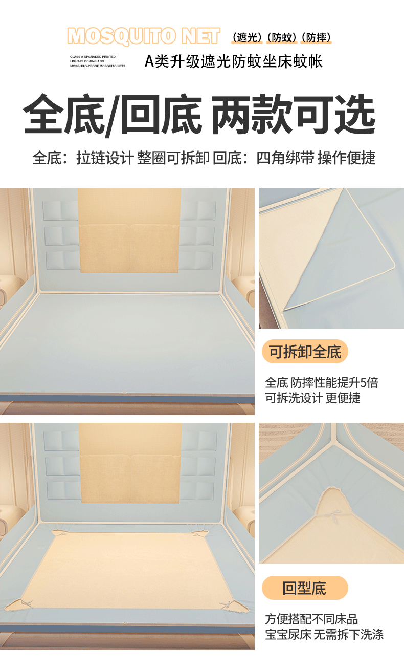 2025新款2602四季款纯色遮光帘坐床蚊帐全底回底双排储物袋