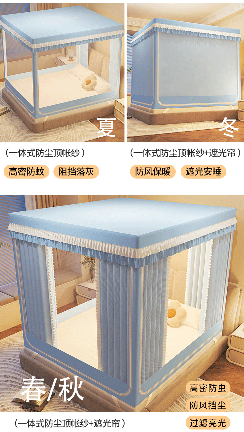 2025新款2602四季款纯色遮光帘坐床蚊帐全底回底双排储物袋