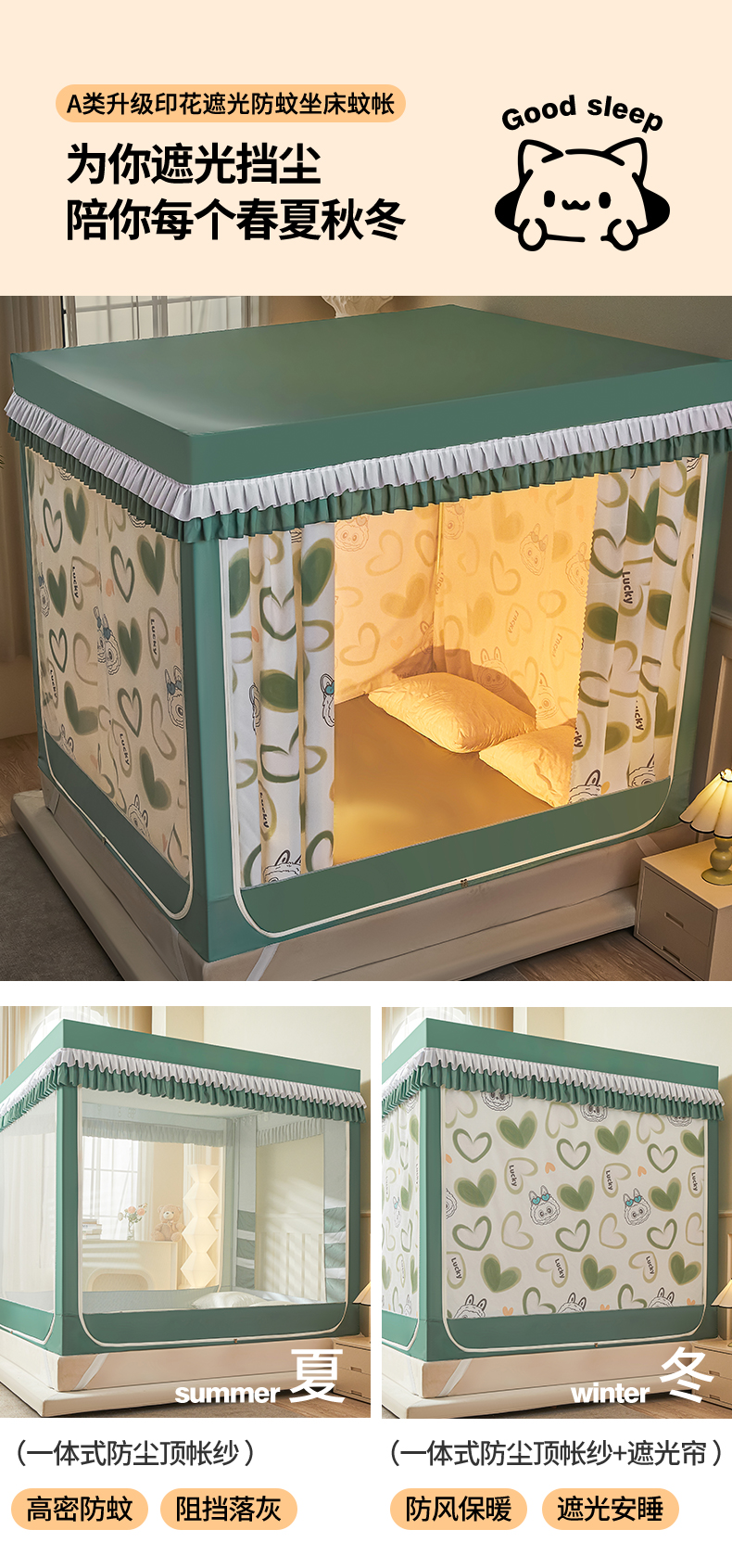 2025新款2601四季款印花遮光帘坐床蚊帐全底回底双排储物袋