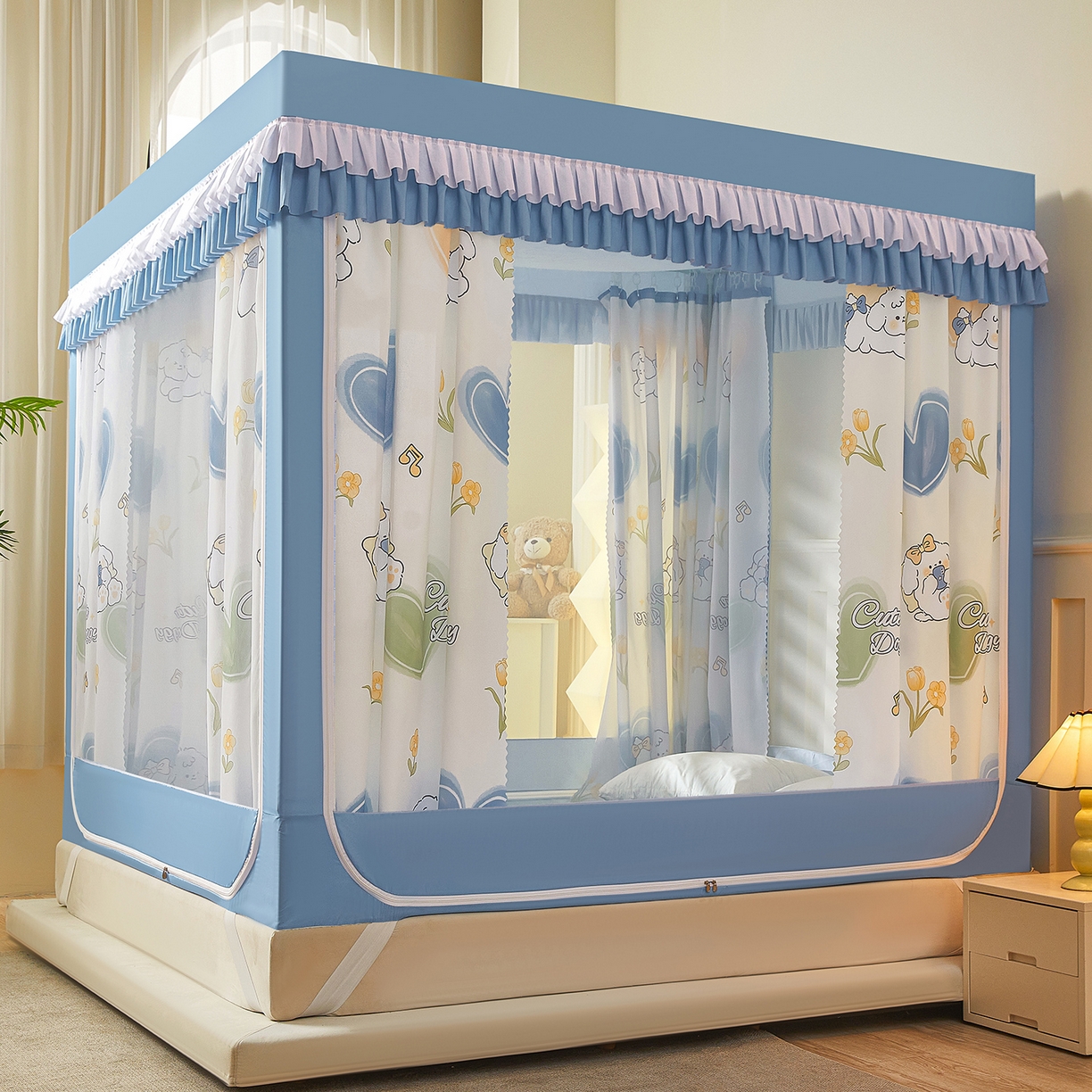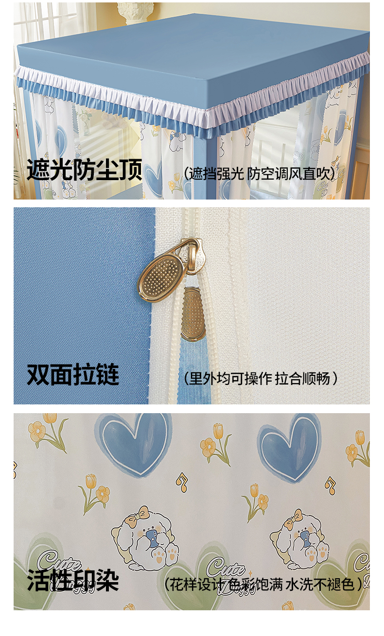 > 迪凡保罗蚊帐 2025新款2601四季款印花遮光帘坐床蚊帐全底回底双排储物袋 爱心小狗-带床帘