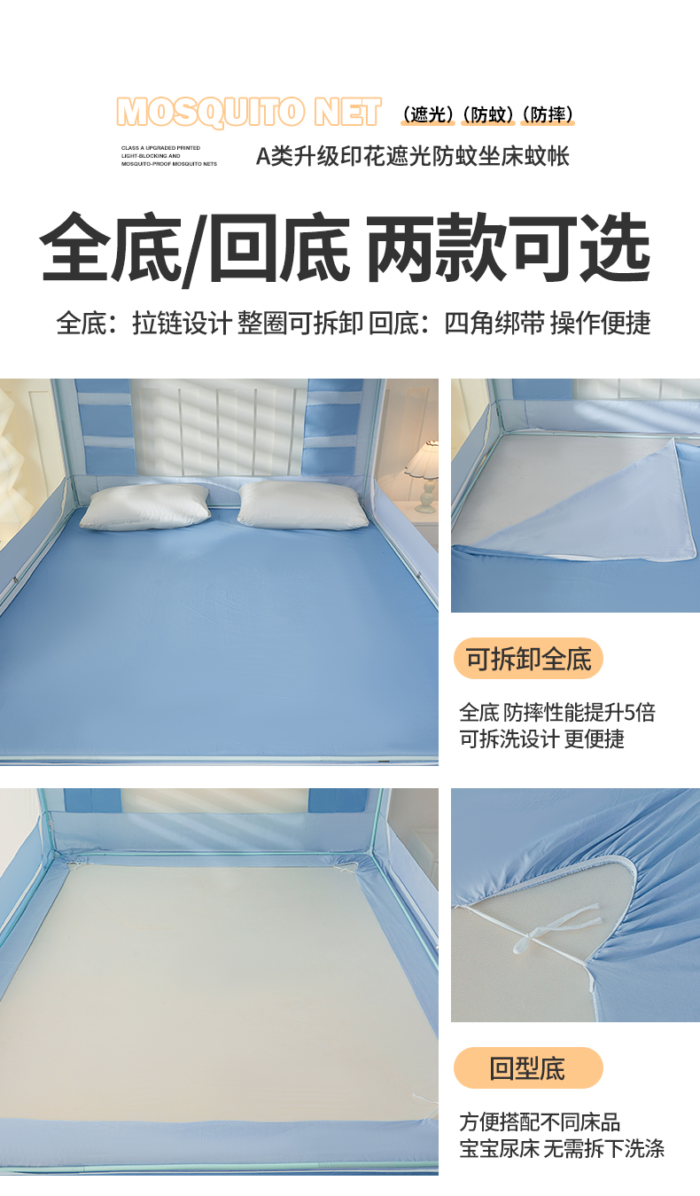 2025新款2602四季款纯色遮光帘坐床蚊帐全底回底双排储物袋