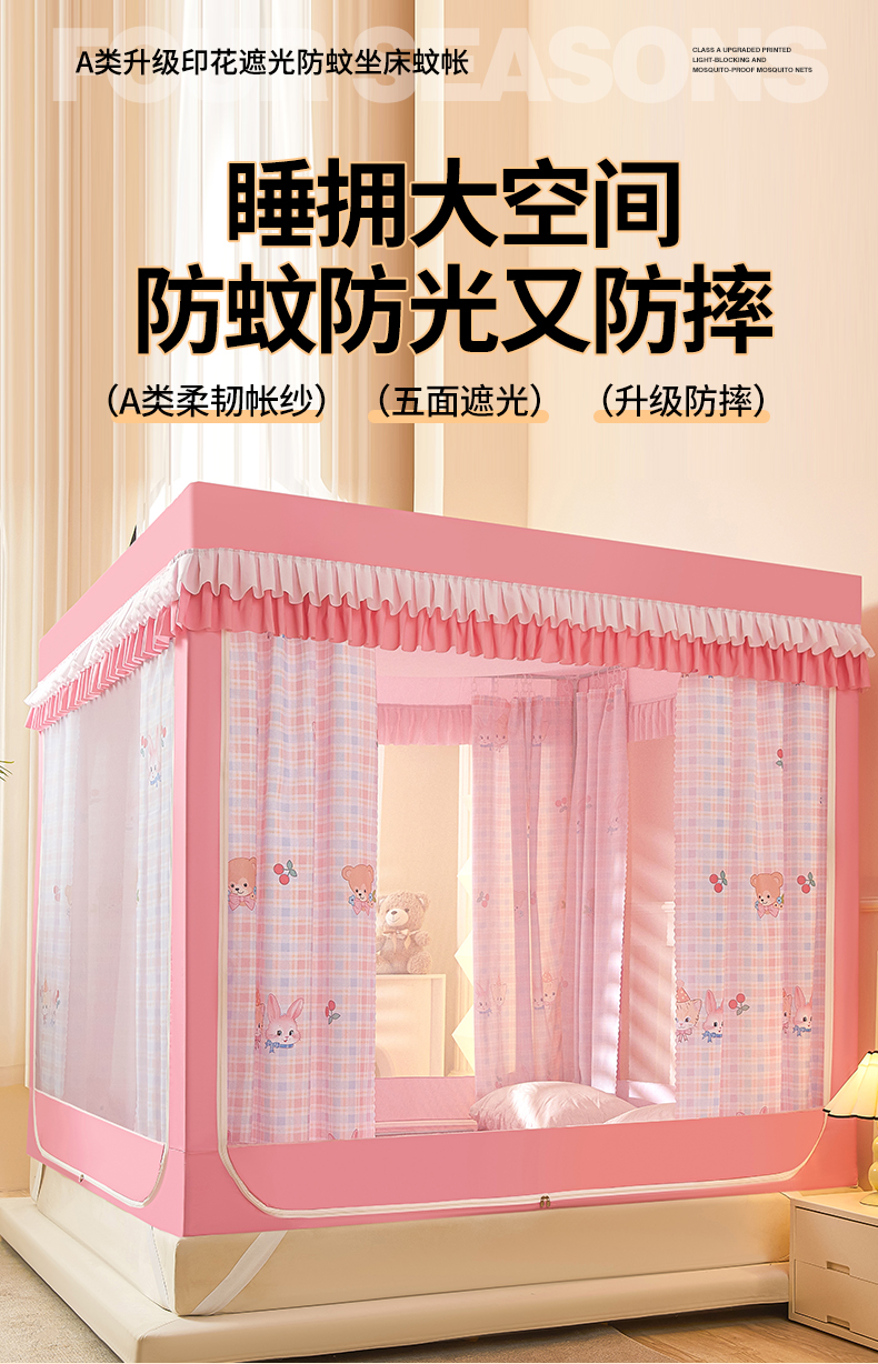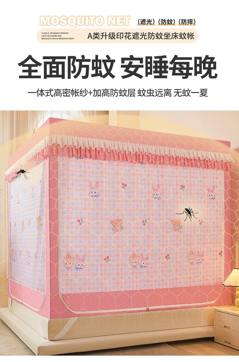 2025新款2601四季款印花遮光帘坐床蚊帐全底回底双排储物袋