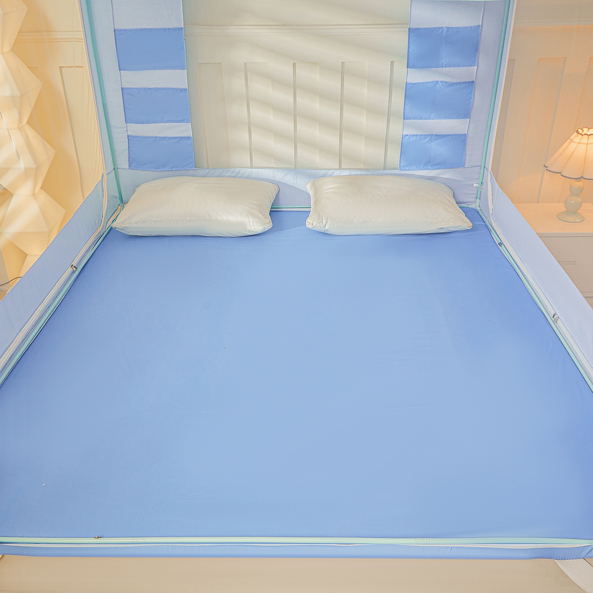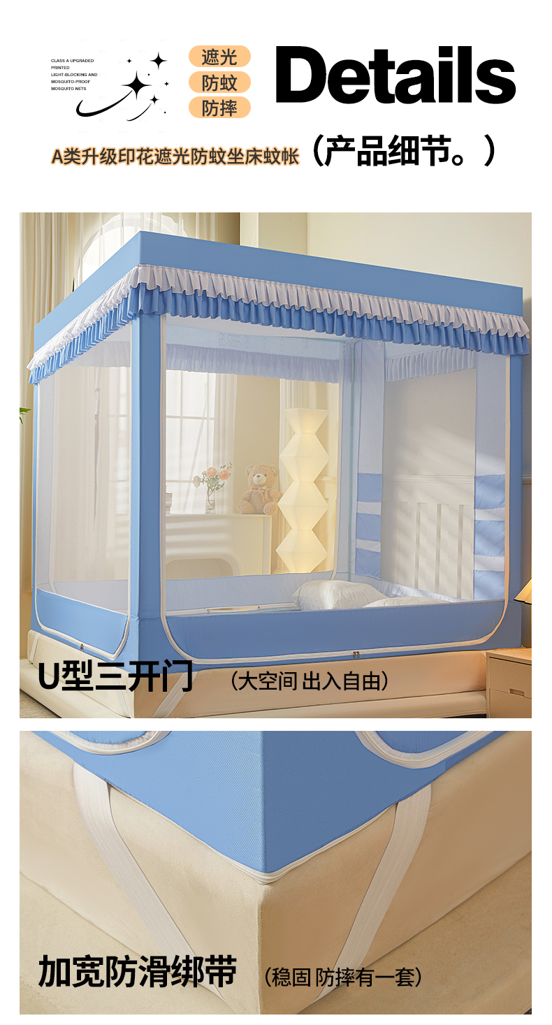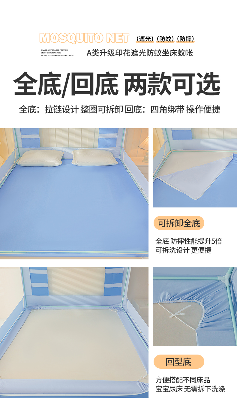2025新款2602四季款纯色遮光帘坐床蚊帐全底回底双排储物袋