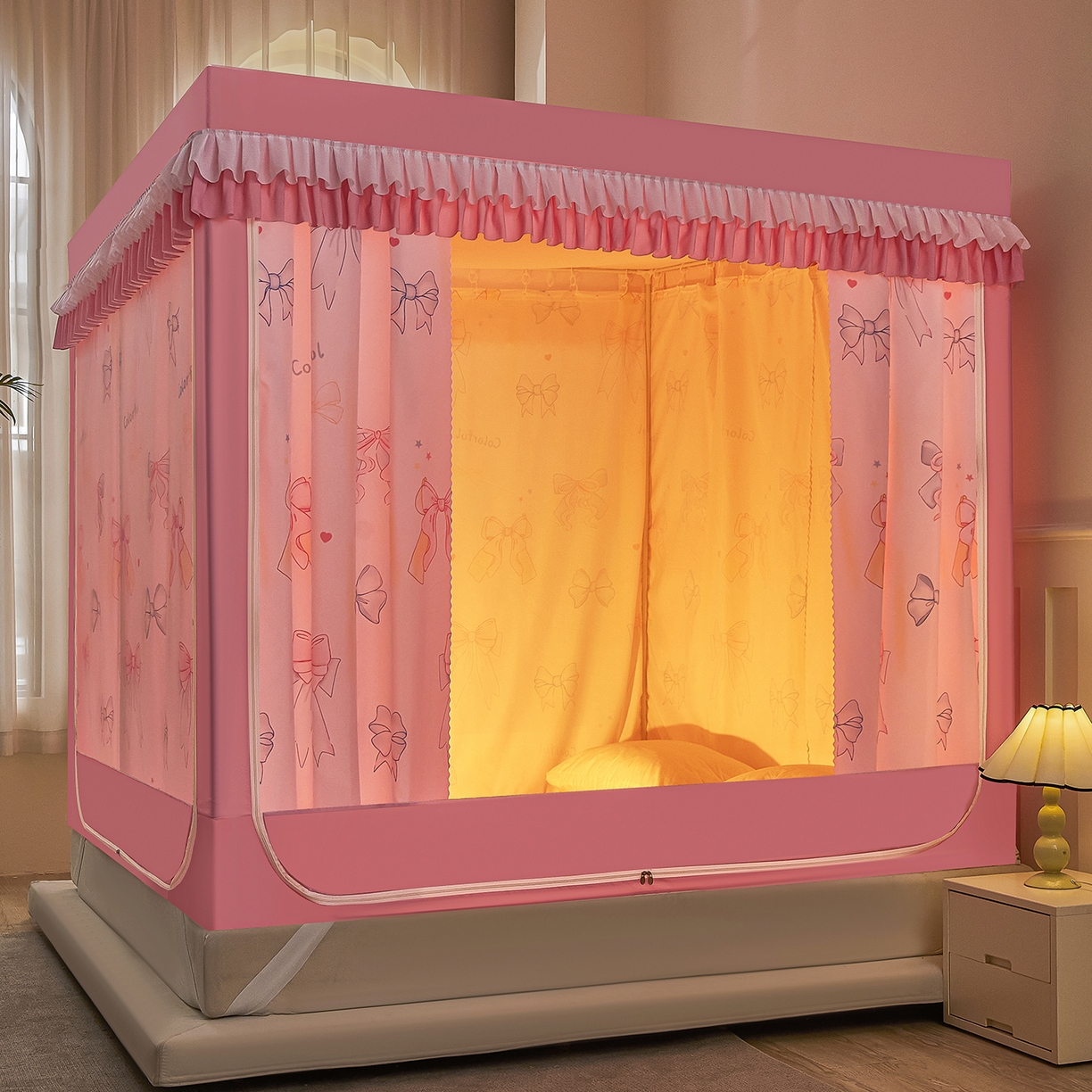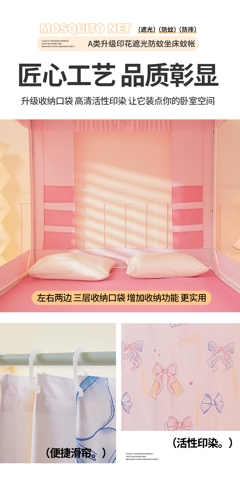 2025新款2602四季款纯色遮光帘坐床蚊帐全底回底双排储物袋