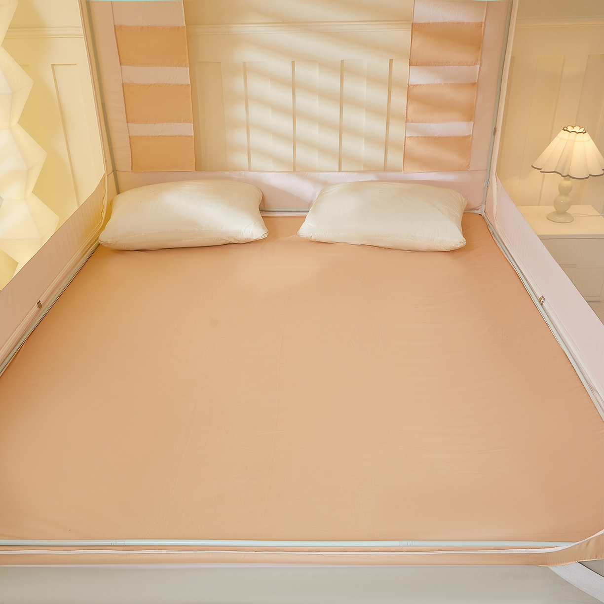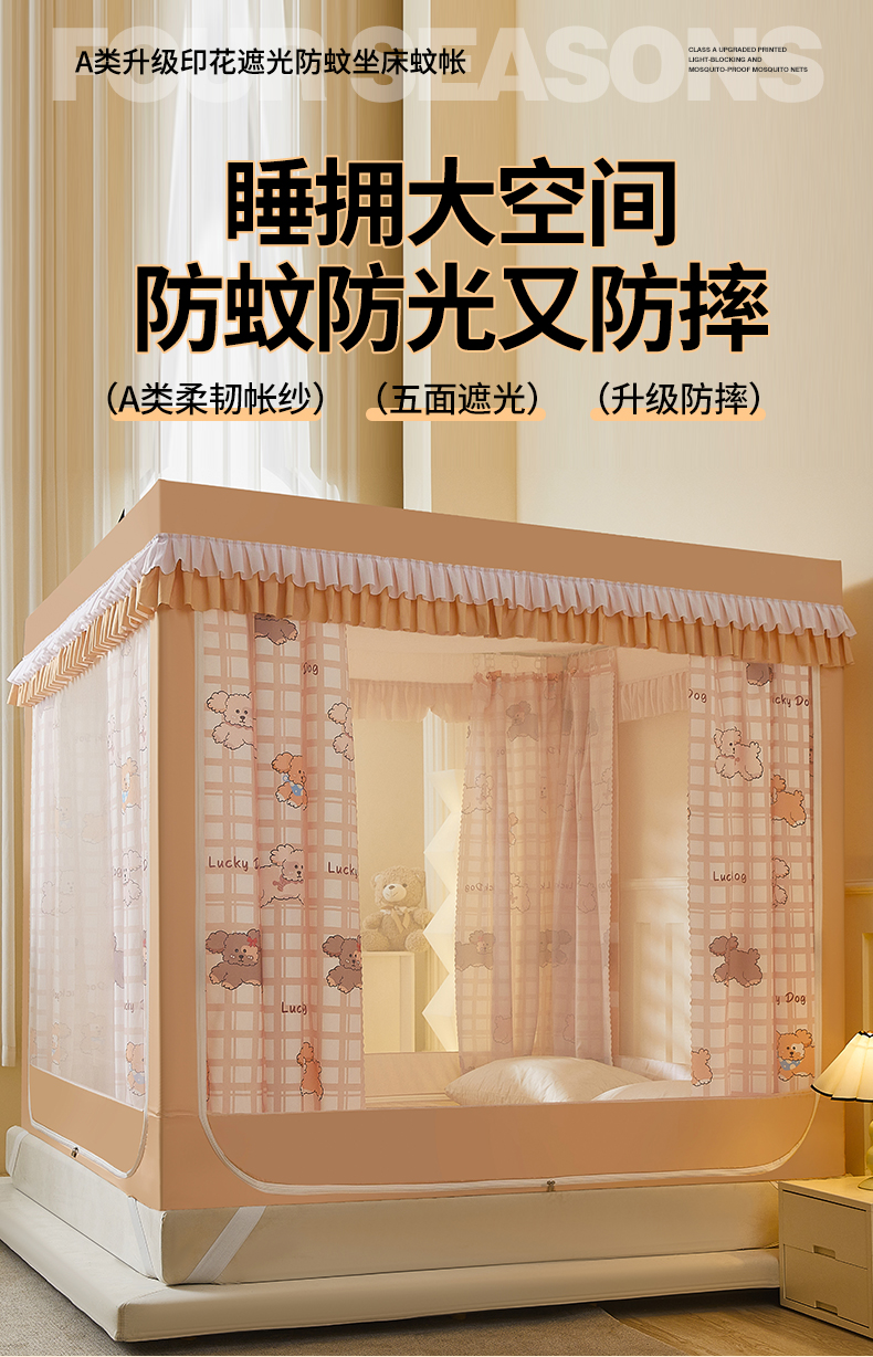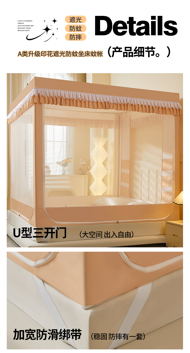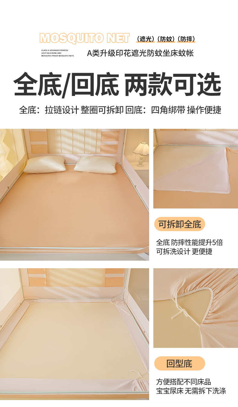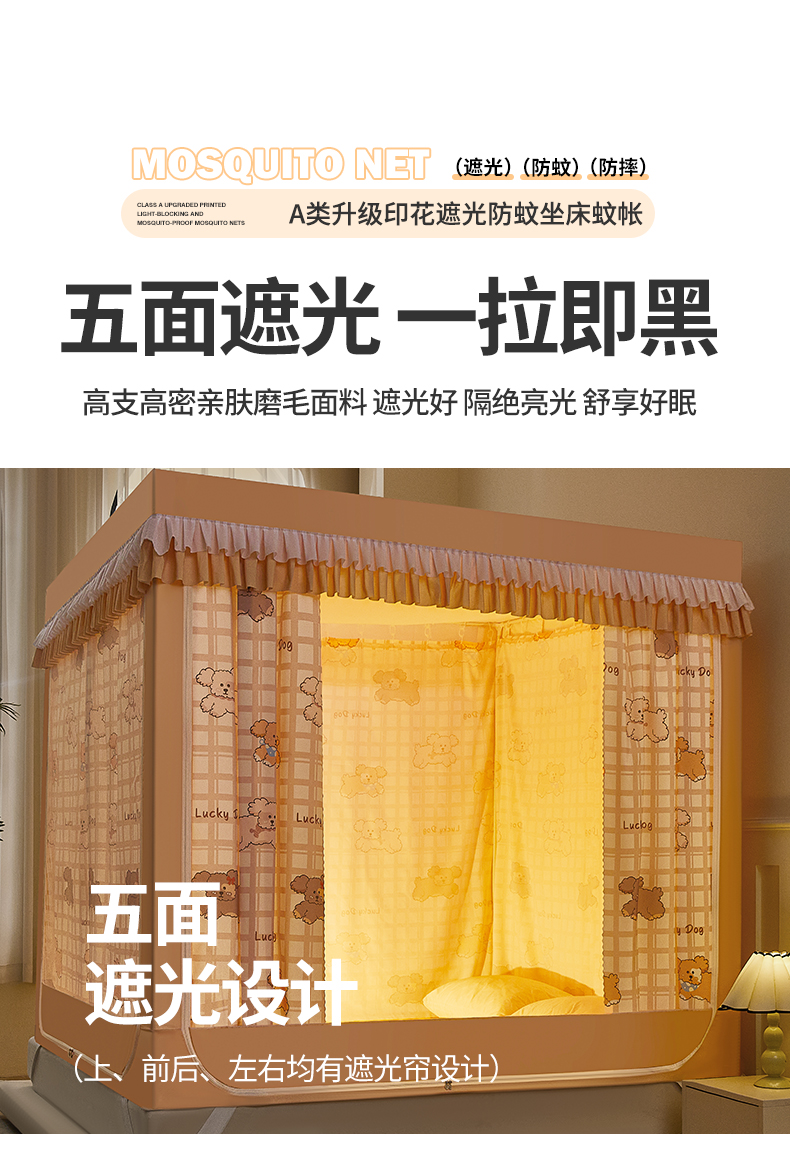 2025新款2602四季款纯色遮光帘坐床蚊帐全底回底双排储物袋