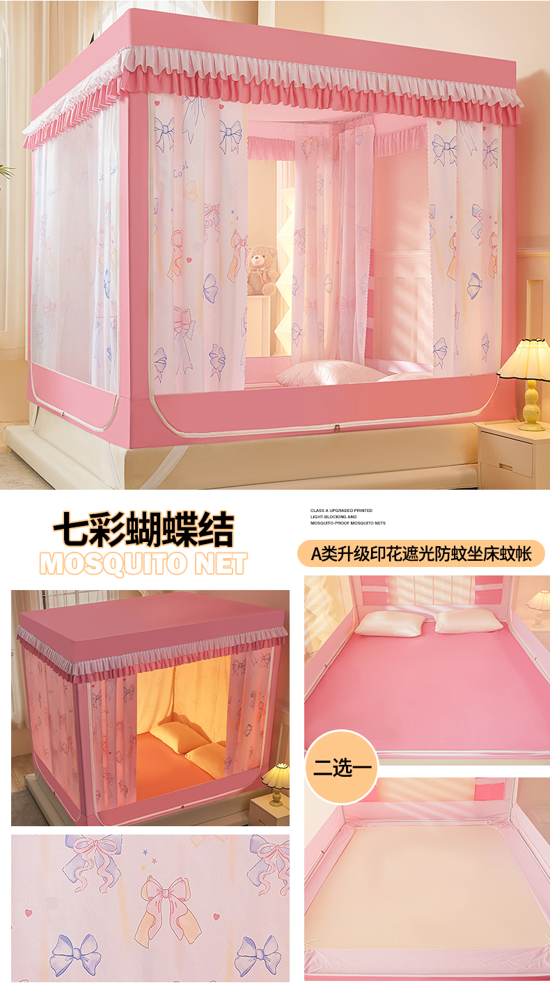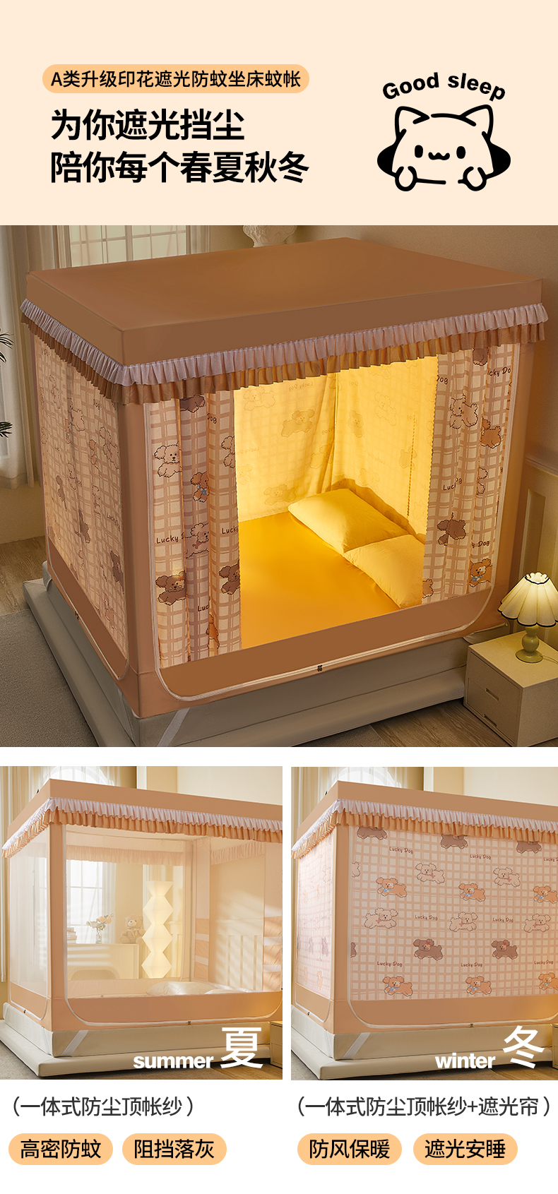 2025新款2601四季款印花遮光帘坐床蚊帐全底回底双排储物袋