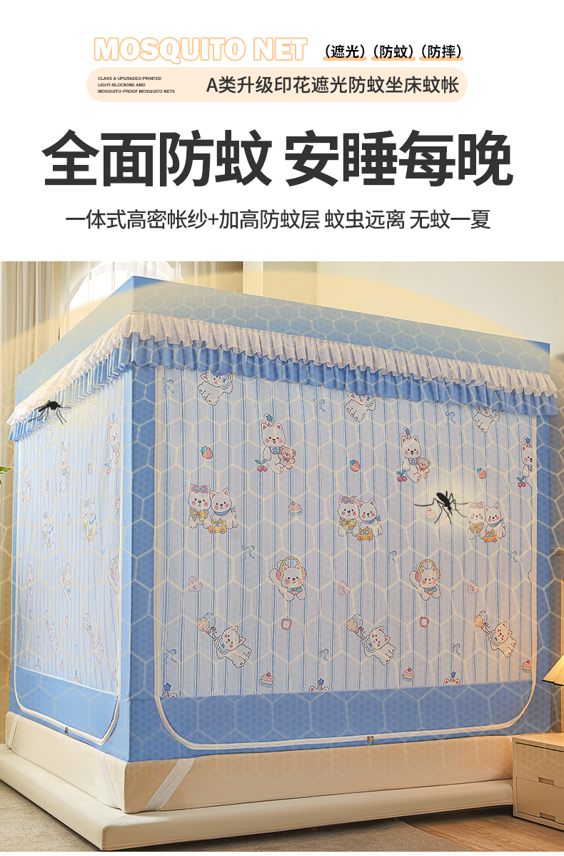 2025新款2601四季款印花遮光帘坐床蚊帐全底回底双排储物袋