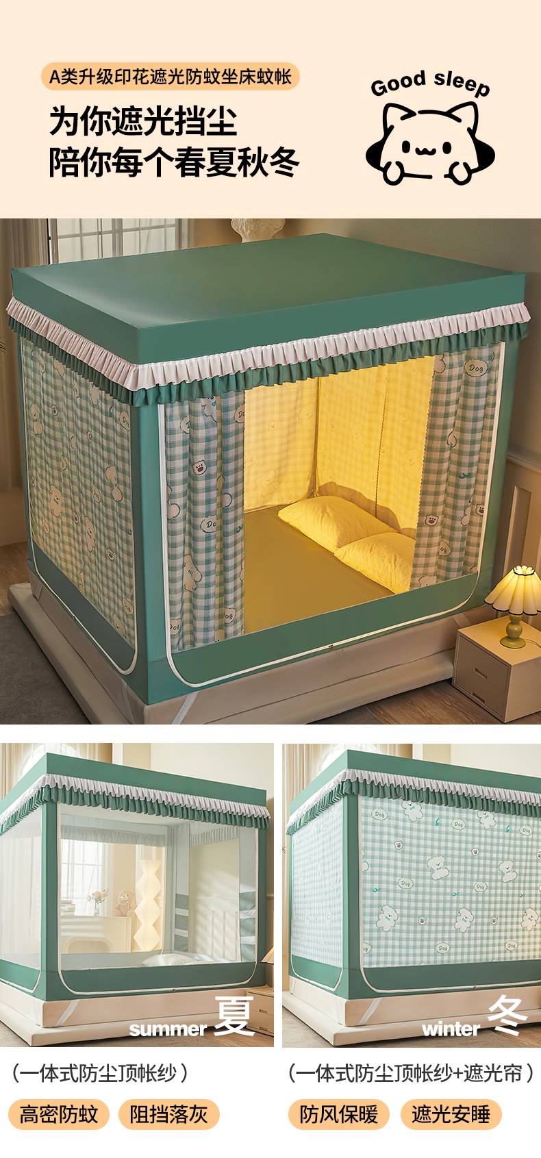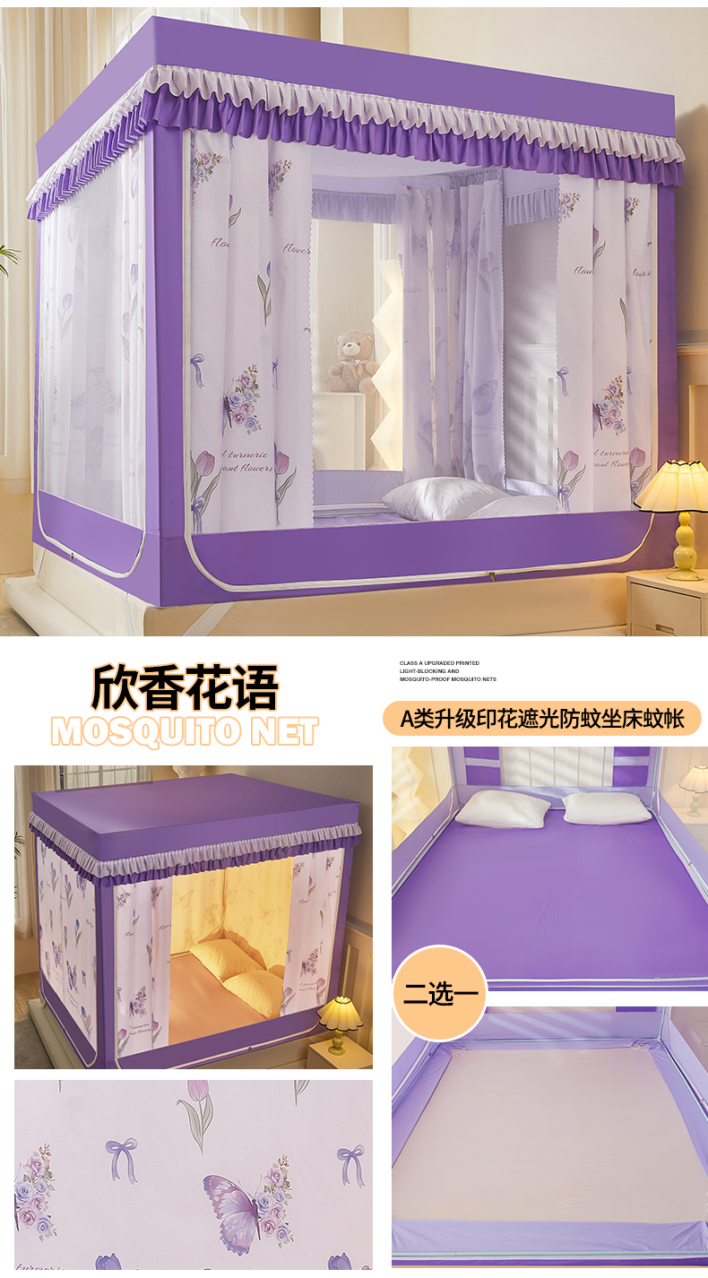 2025新款2601四季款印花遮光帘坐床蚊帐全底回底双排储物袋