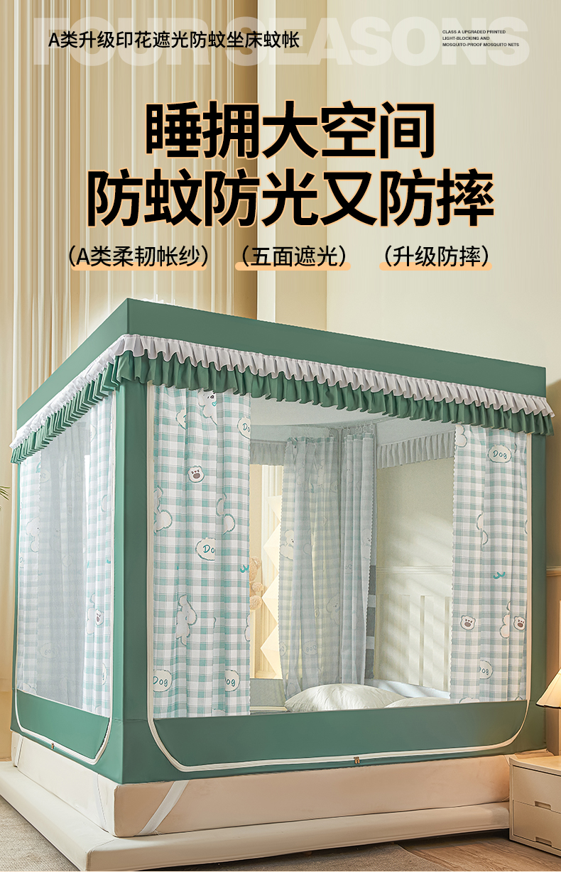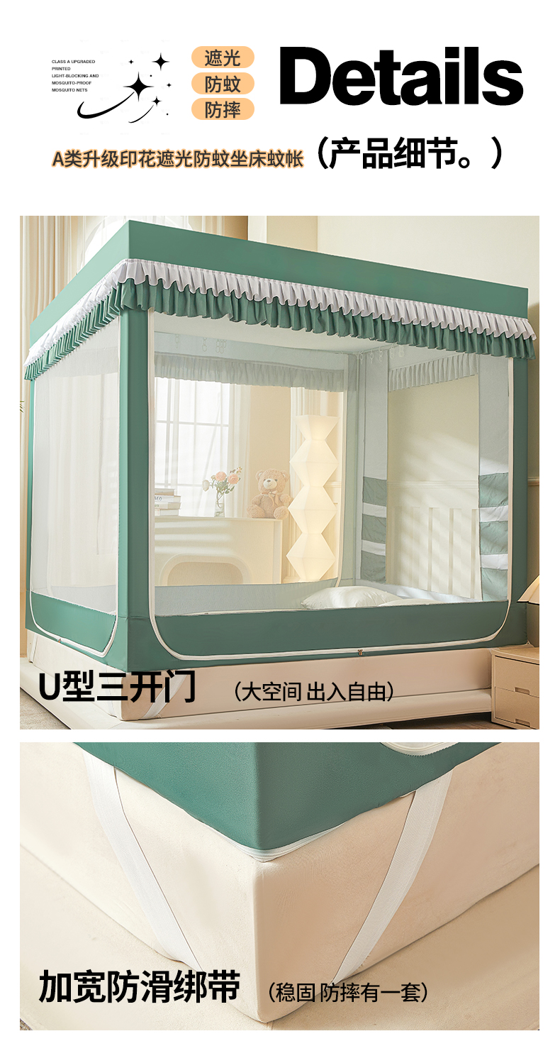 2025新款2602四季款纯色遮光帘坐床蚊帐全底回底双排储物袋