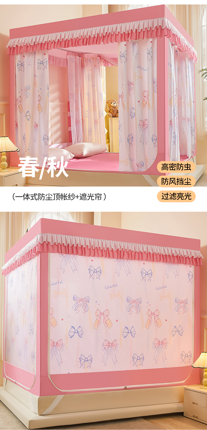 2025新款2602四季款纯色遮光帘坐床蚊帐全底回底双排储物袋