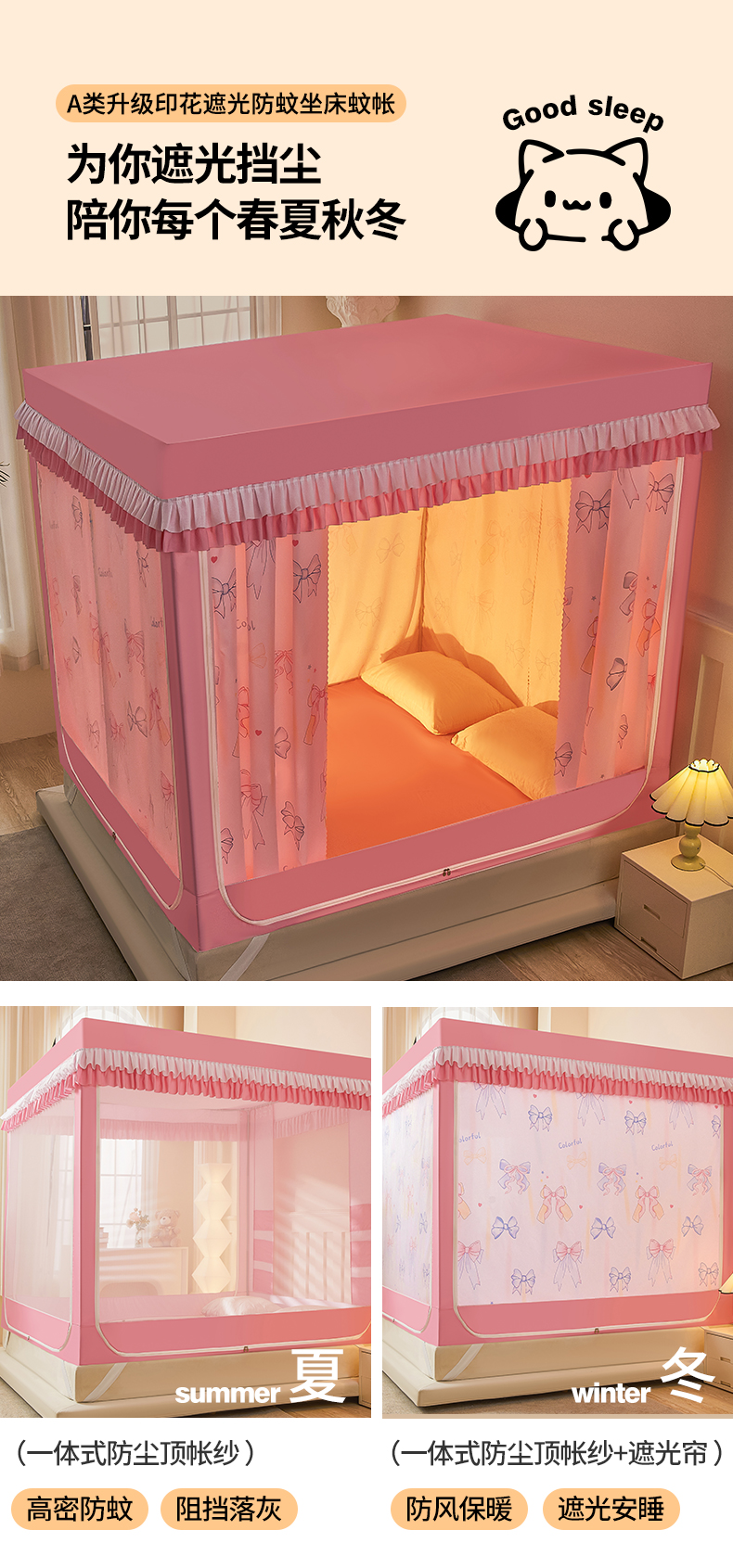 2025新款2601四季款印花遮光帘坐床蚊帐全底回底双排储物袋