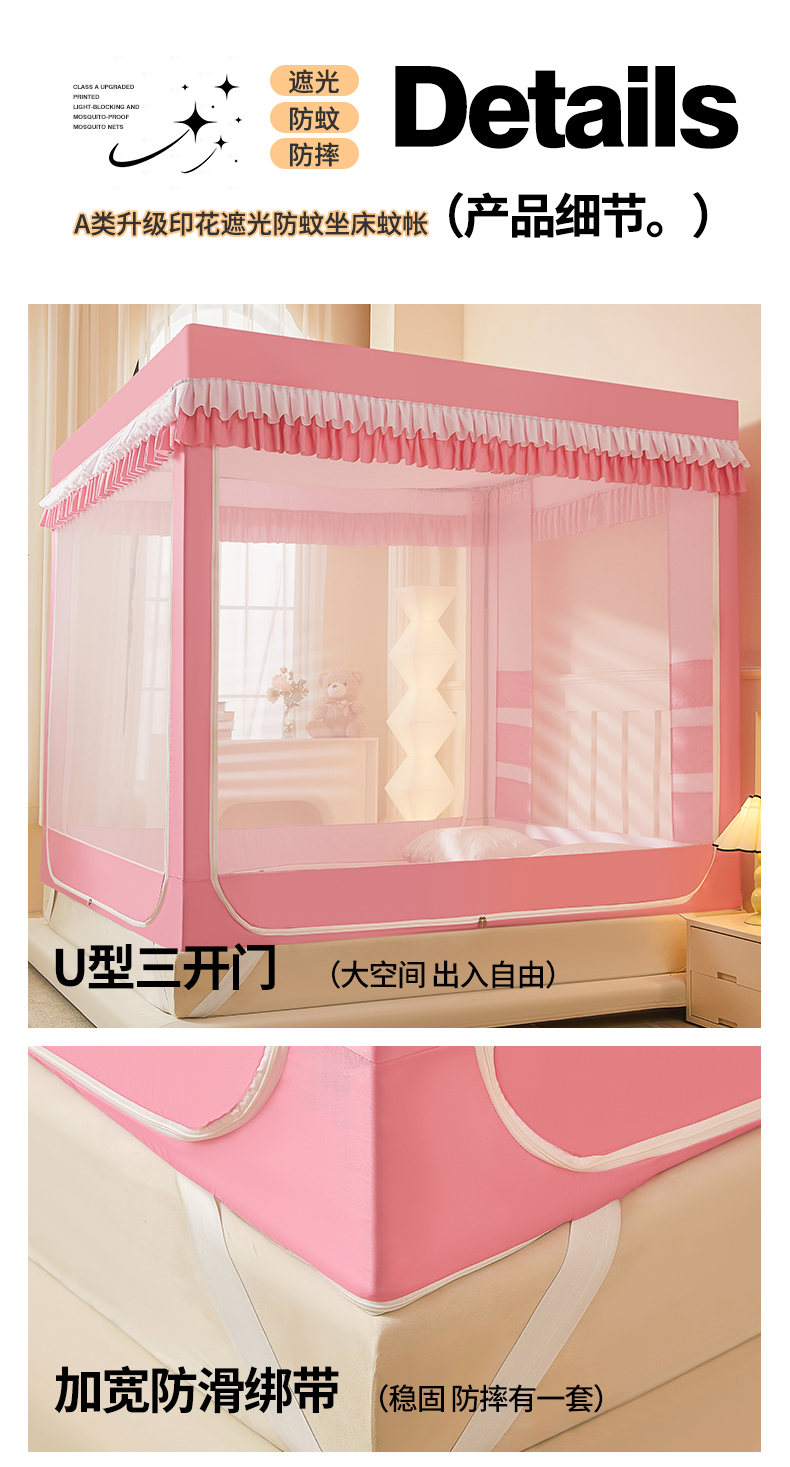 2025新款2602四季款纯色遮光帘坐床蚊帐全底回底双排储物袋