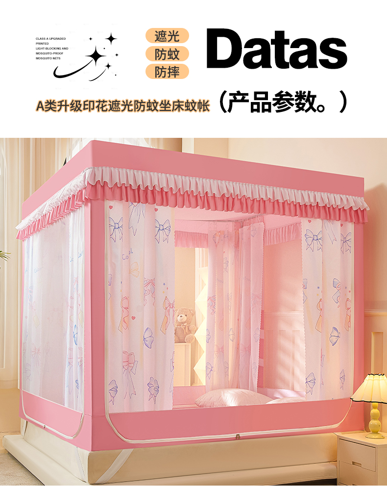 2025新款2602四季款纯色遮光帘坐床蚊帐全底回底双排储物袋