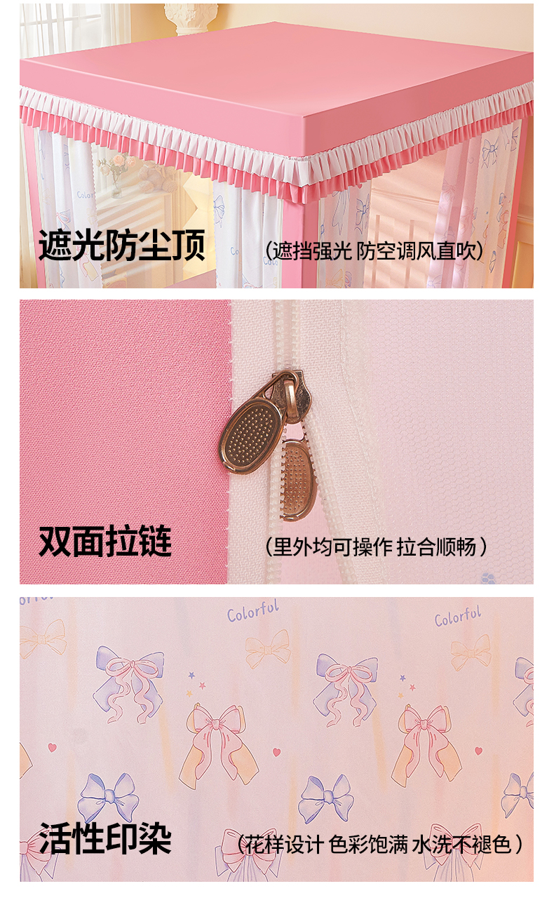 2025新款2602四季款纯色遮光帘坐床蚊帐全底回底双排储物袋