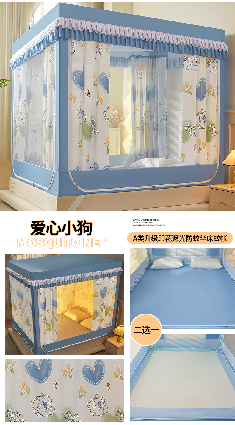 2025新款2601四季款印花遮光帘坐床蚊帐全底回底双排储物袋