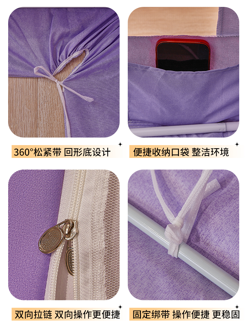 2026新款2602四季款纯色遮光帘坐床蚊帐全底回底双排储物袋