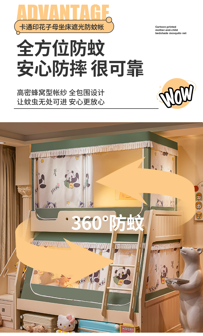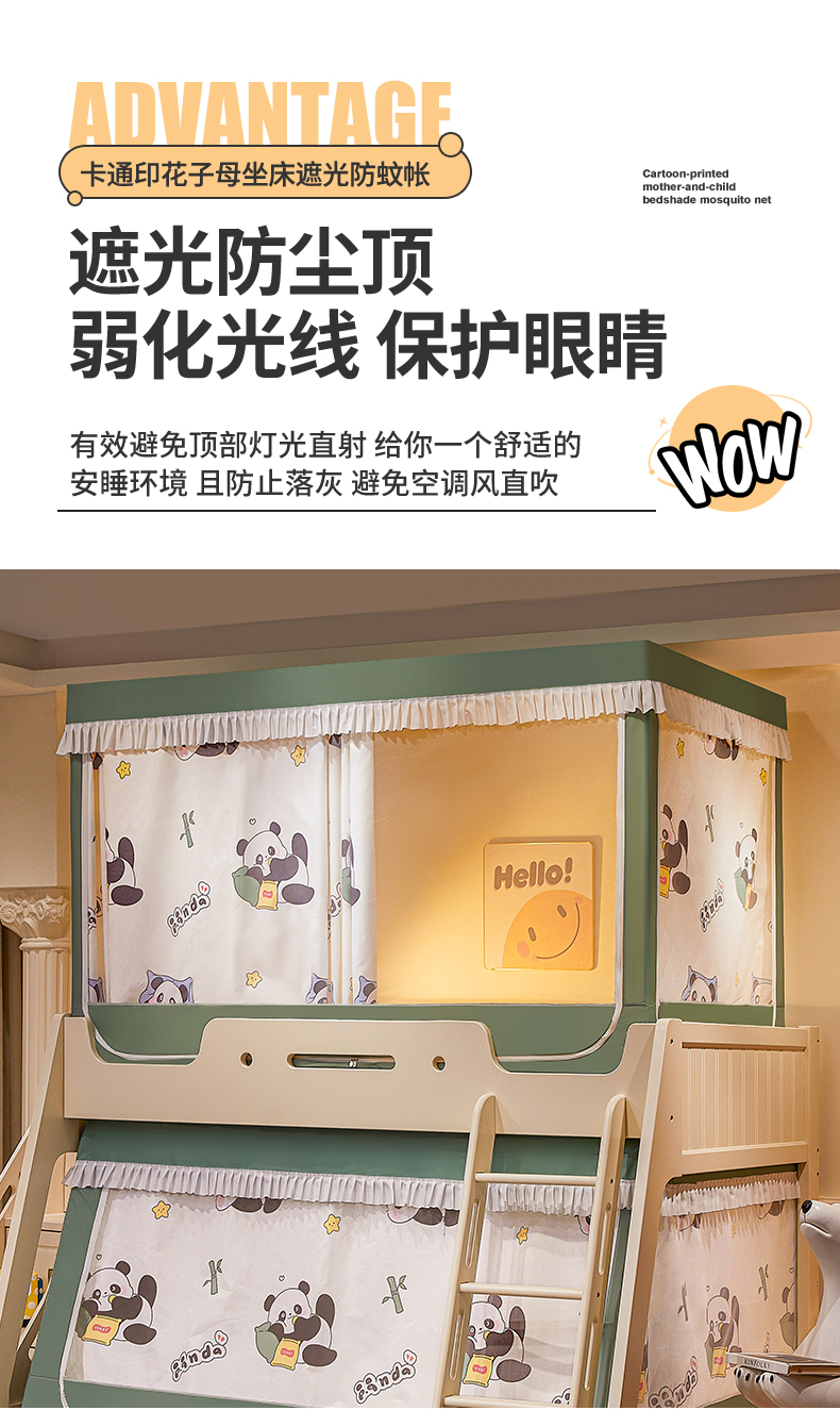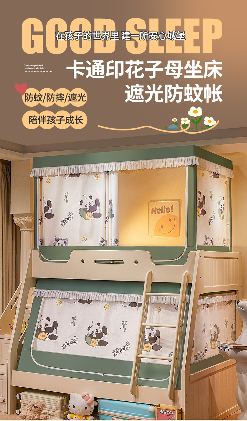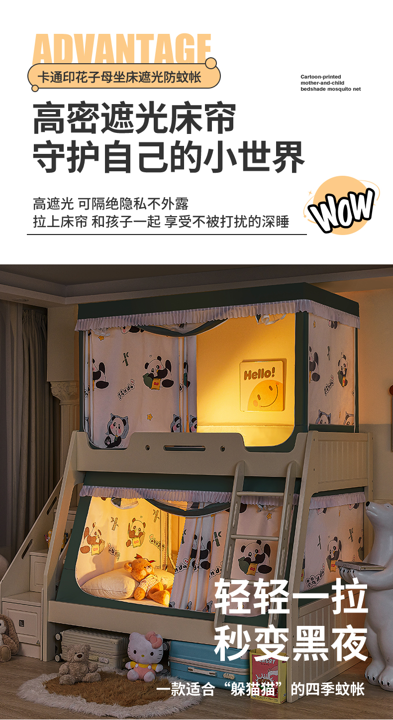 迪凡保罗蚊帐 2026新款全伸缩上下铺子母遮光帘蚊帐 休闲熊猫-有床帘
