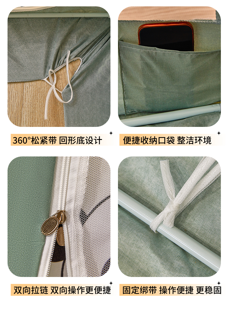 2026新款2602四季款纯色遮光帘坐床蚊帐全底回底双排储物袋