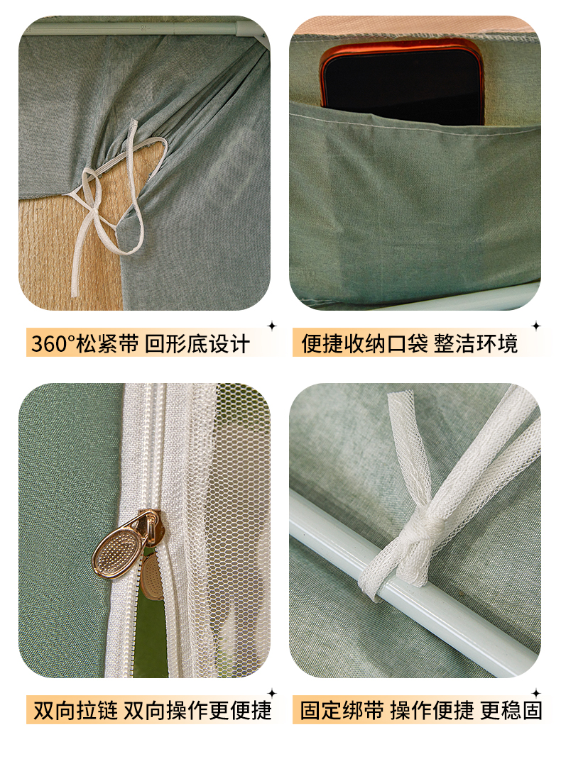 2026新款2602四季款纯色遮光帘坐床蚊帐全底回底双排储物袋