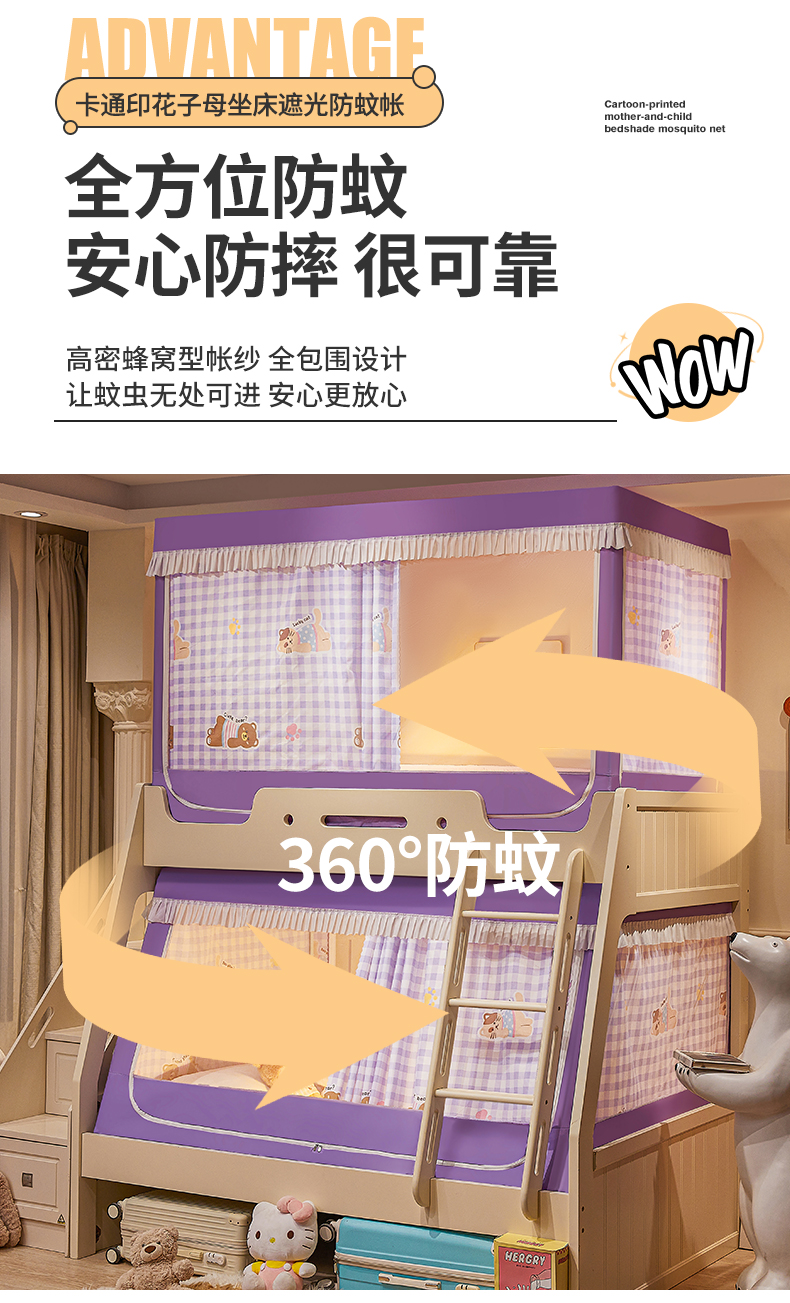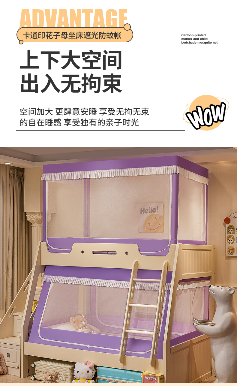 迪凡保罗蚊帐 2026新款全伸缩上下铺子母遮光帘蚊帐 可爱乐园-有床帘