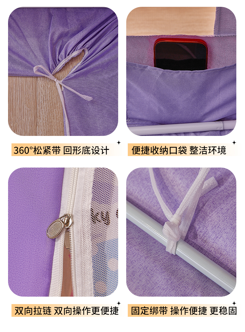 2026新款2602四季款纯色遮光帘坐床蚊帐全底回底双排储物袋