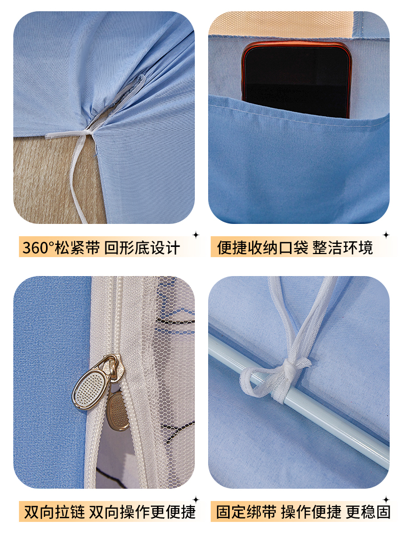 2026新款2602四季款纯色遮光帘坐床蚊帐全底回底双排储物袋