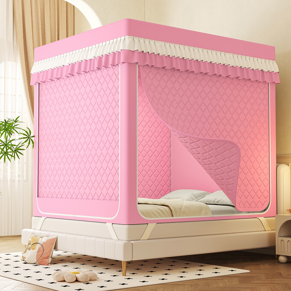 迪凡保罗蚊帐 2025新款2604冬季保暖夹棉纯色遮光帘蚊帐全底回底双排储物袋 樱花粉