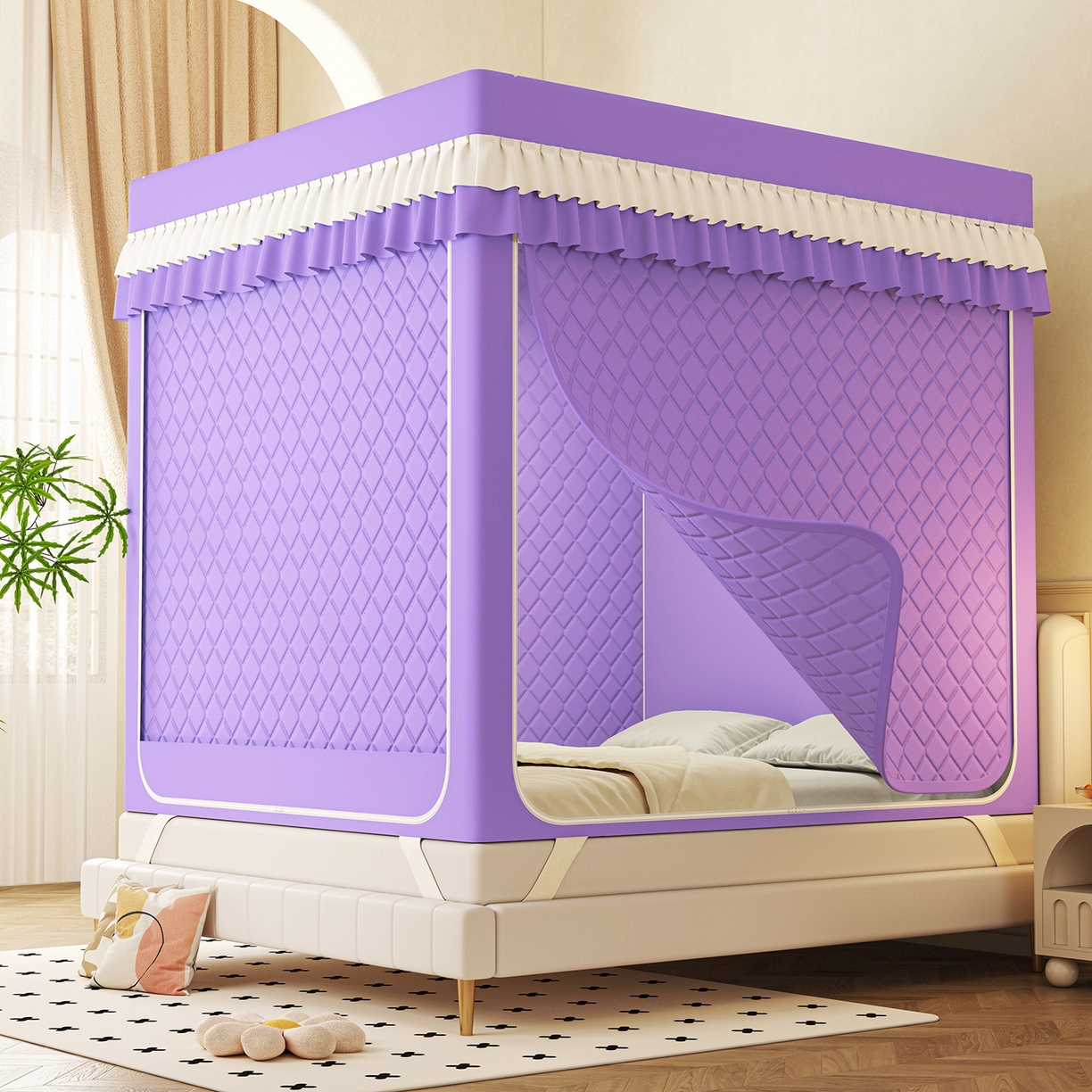 迪凡保罗蚊帐 2025新款2604冬季保暖夹棉纯色遮光帘蚊帐全底回底双排储物袋 紫色